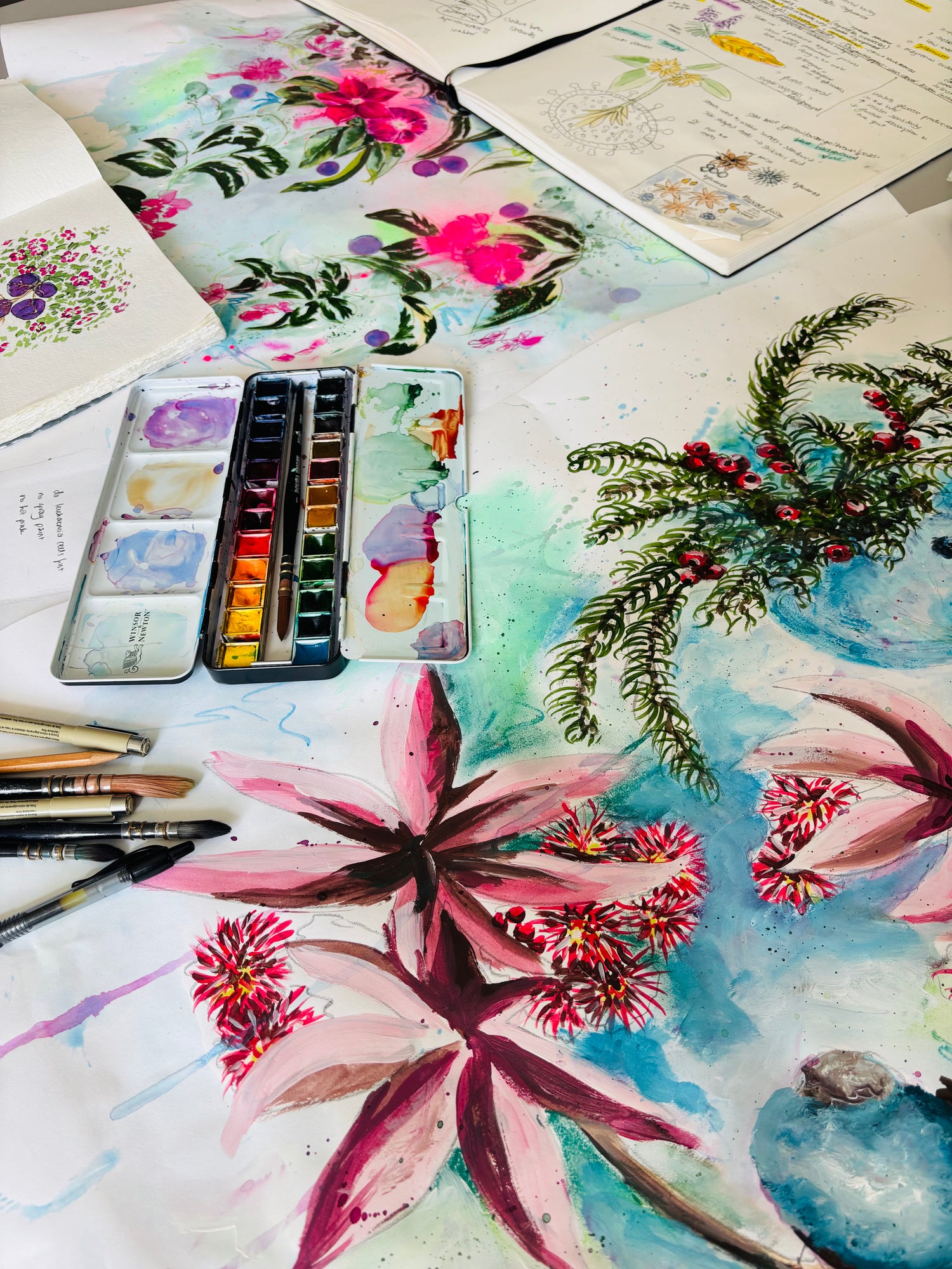 This 2-hour workshop will focus around creating fun, beautiful loose watercolour artworks finished off with some fine pen details to create some quick, punchy, fun artworks to take home. We will learn how to apply minimal colours in selected areas but with enough interest to draw the eye. There will be some splatters, some colour bleeding and creative juices flowing. You will go home bursting with ideas to try!