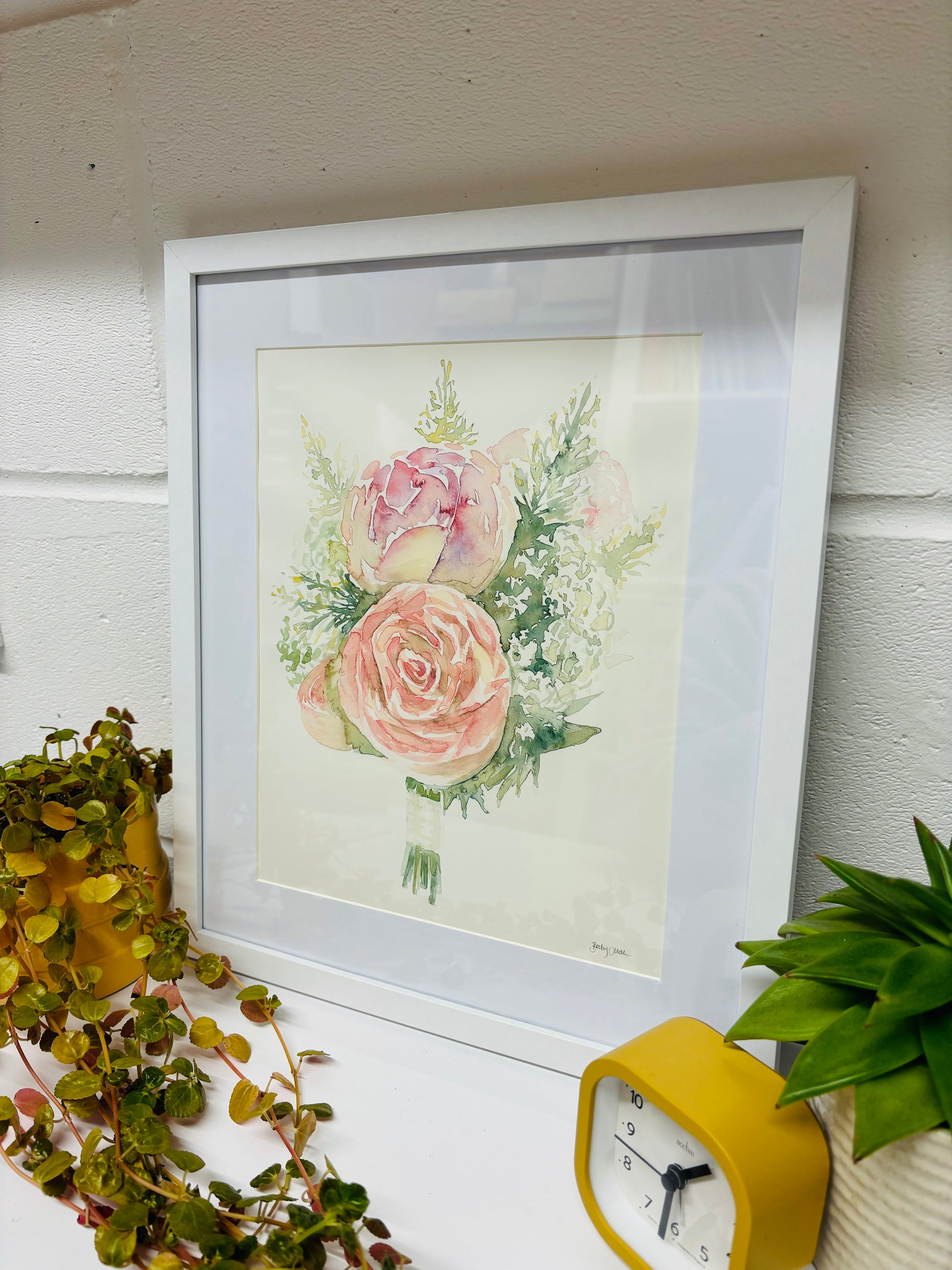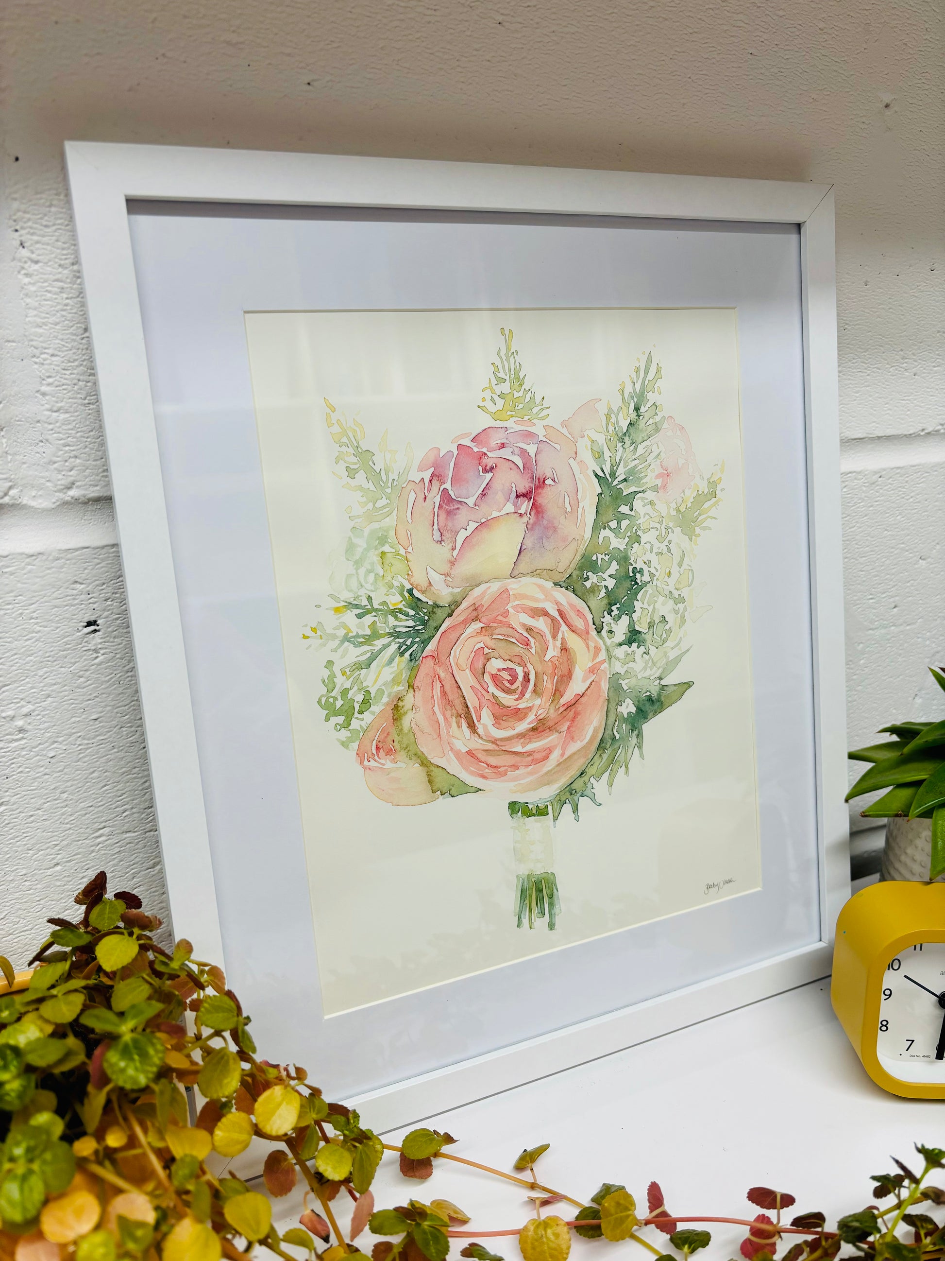 This delicate watercolour brings a sense of serenity and peace, with soft pinks and greens bleeding into other. Painted on hot-press A4 arches paper with Winsor and Newton professinal watercolours and framed in a white frame.