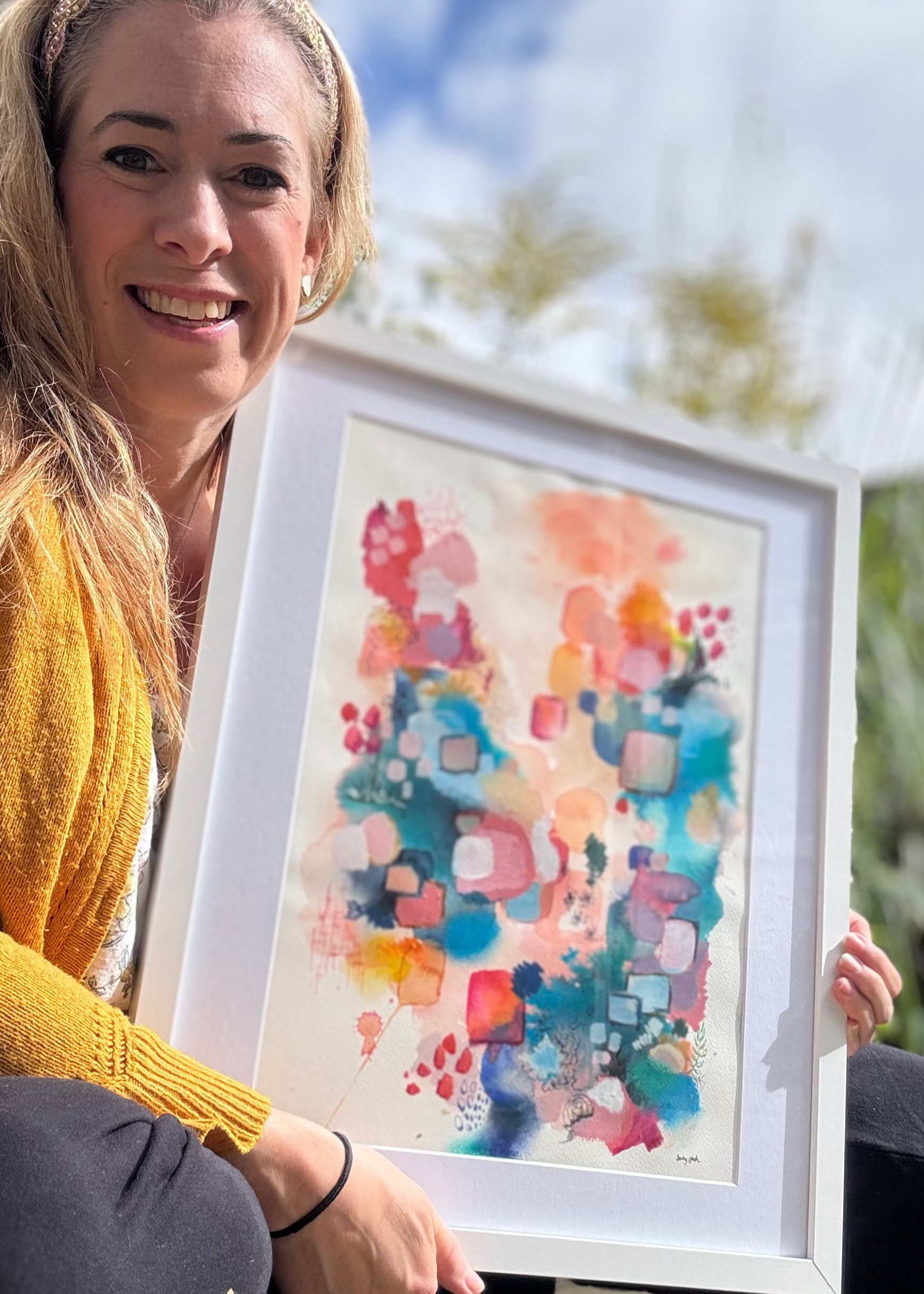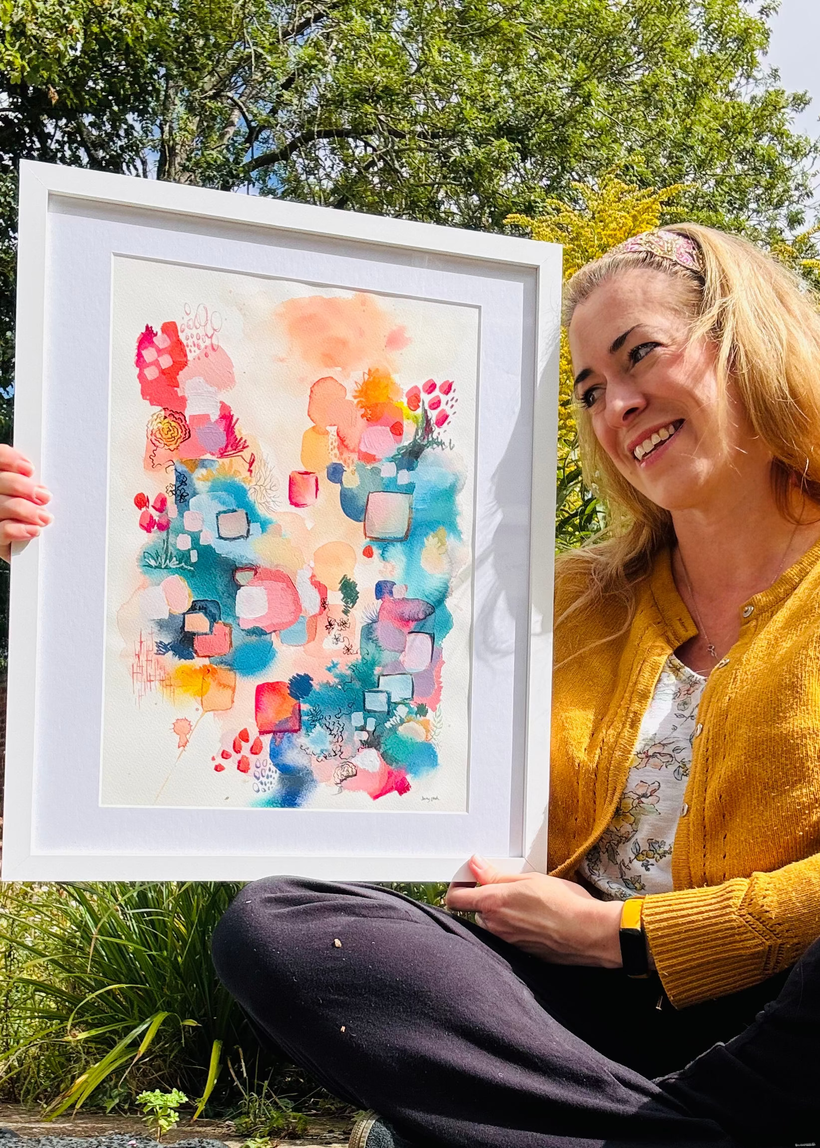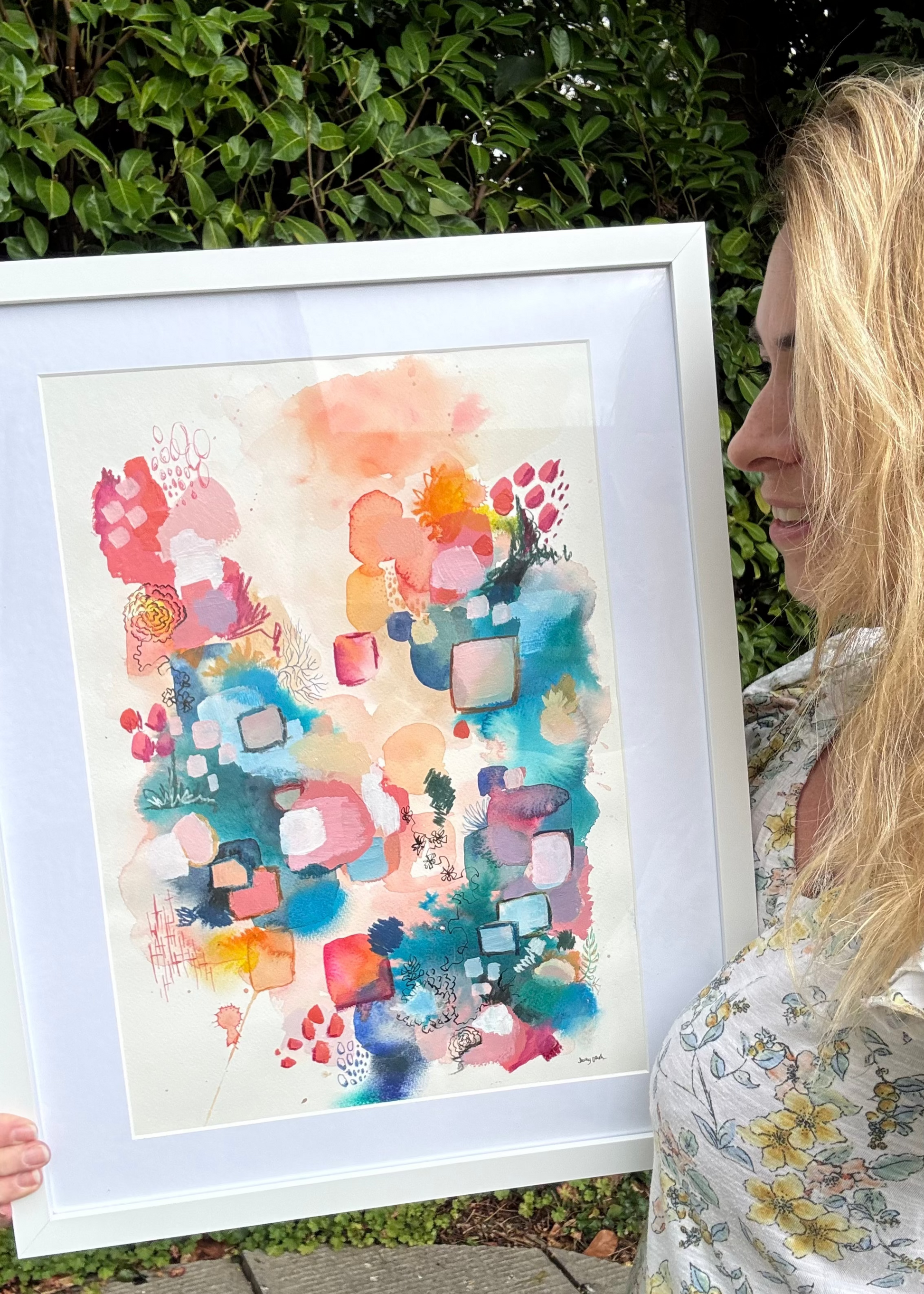 A3 mixed-media artwork on 300gsm watercolour paper, framed in a white, glass-fronted frame, sized 50x40cm.