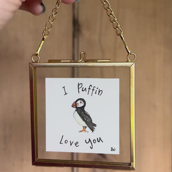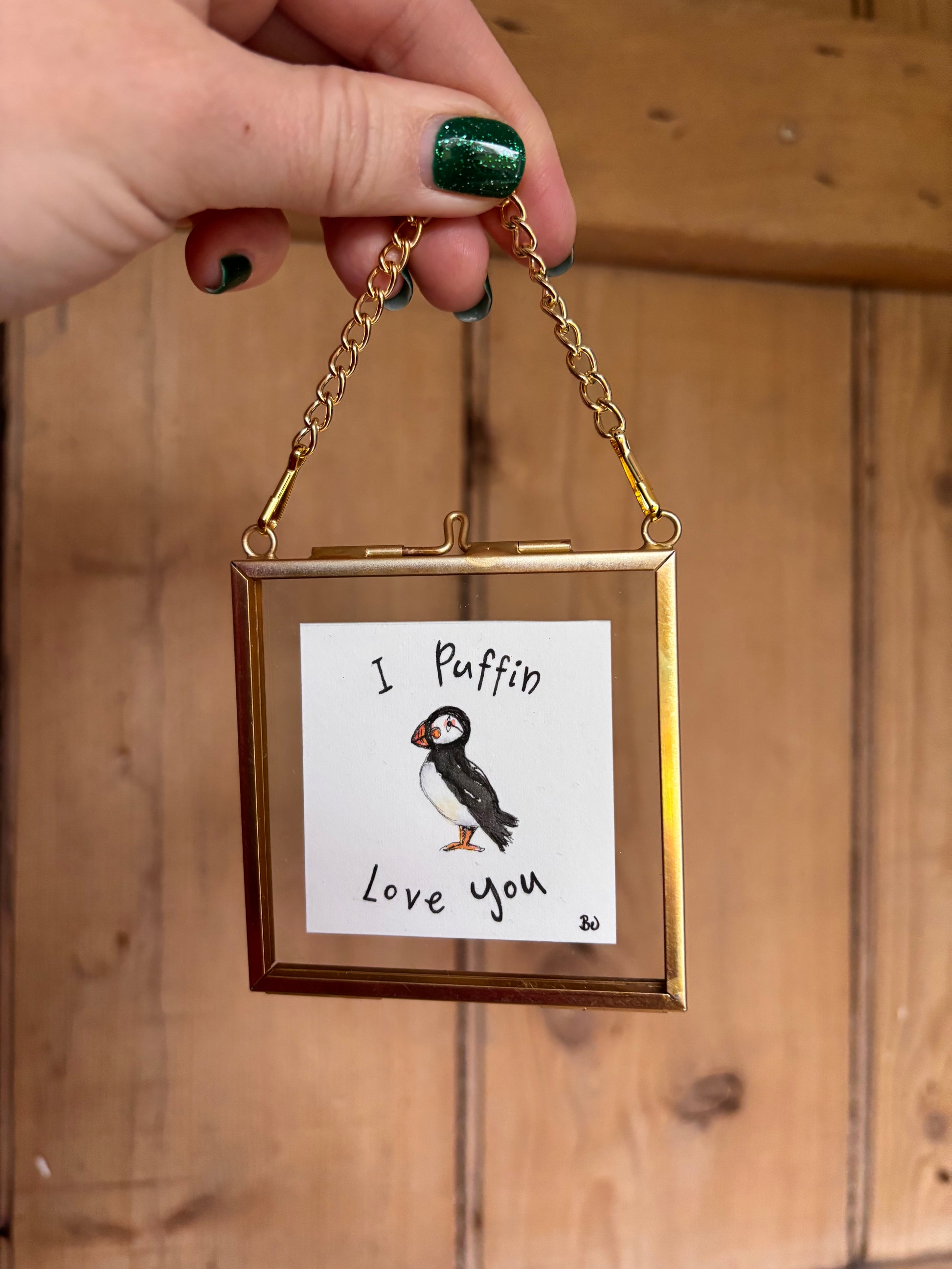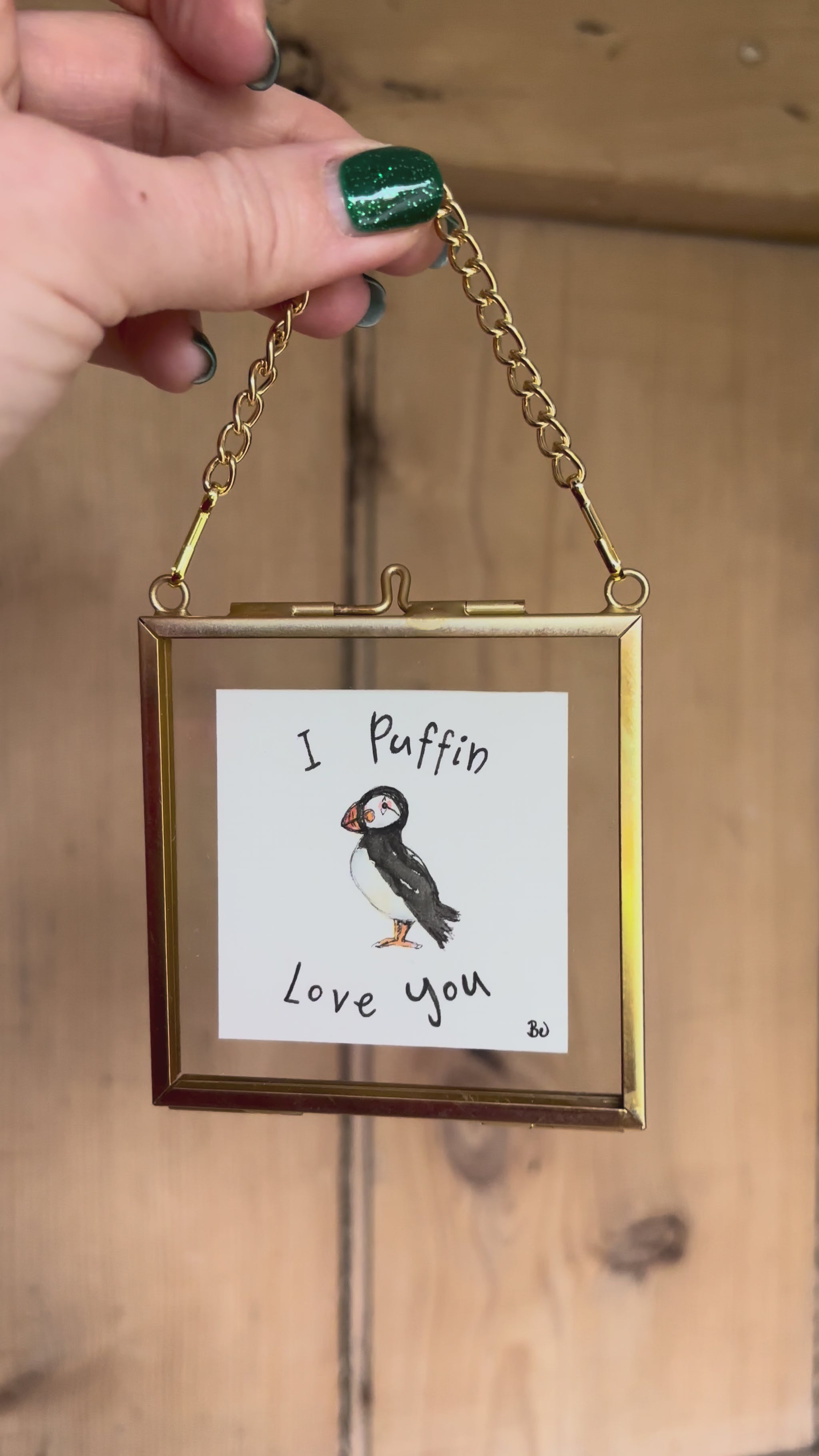 5x5cm miniature original of watercolour and ink on hot-press arches watercolour paper 300gsm. Framed in a floating gold-effect and glass frame which is 7x7cm with a small chain so it can be hung in any little space you find.