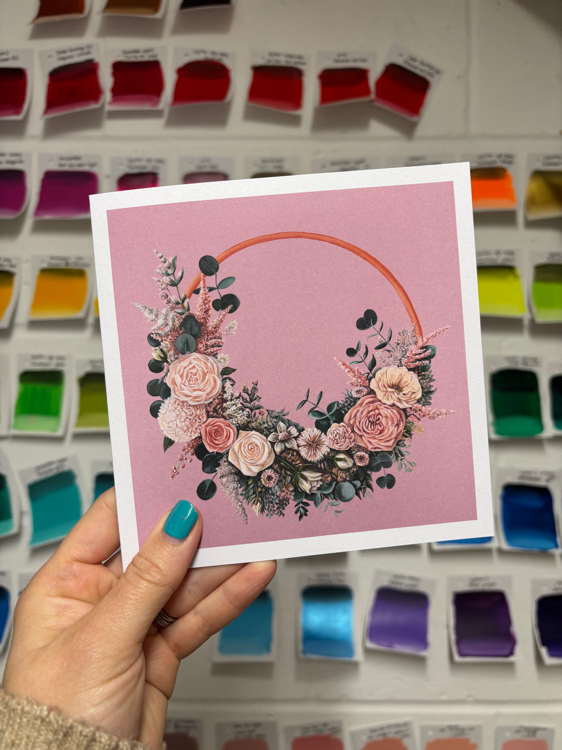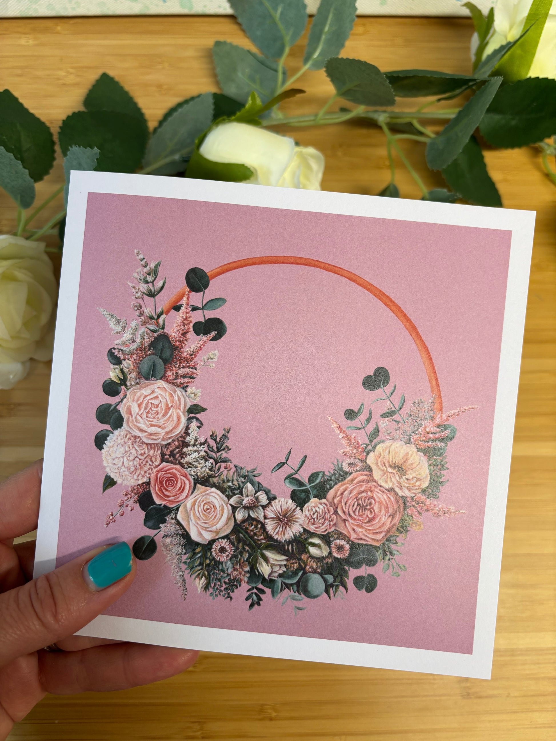 This soft blush floral hoop is a beautiful card for any occasion. This square greeting card measures 150 x 150mm and is printed on 100% Recycled Matt 300gsm. It comes with a high-quality white envelope, safely packaged in a biodegradable clear bag.