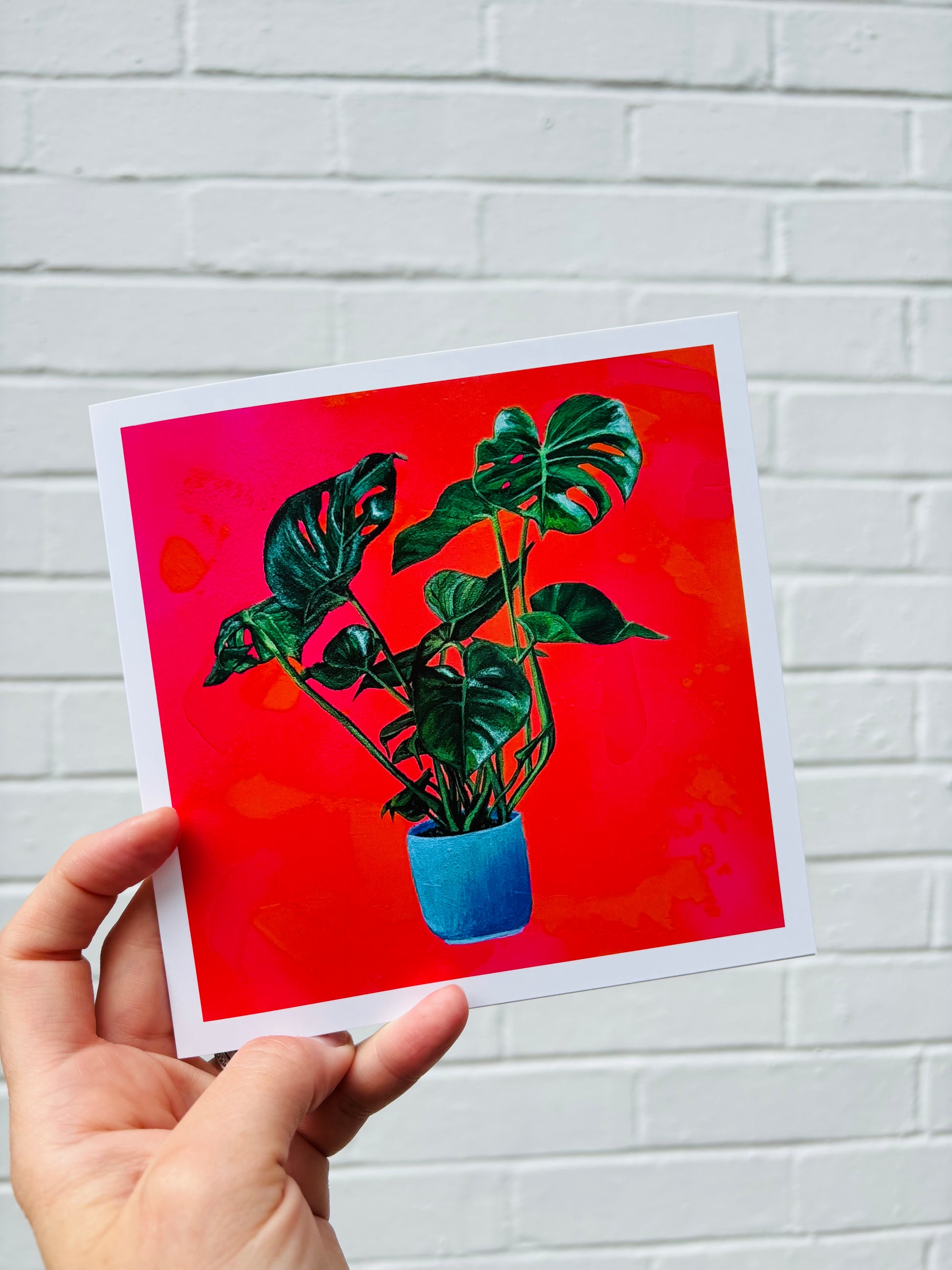 This quirky prayer plant is stunning on this vibrant yellow and pink background. This square greeting card measures 150 x 150mm and is printed on 100% Recycled Matt 300gsm. It comes with a high-quality white envelope, safely packaged in a biodegradable clear bag.