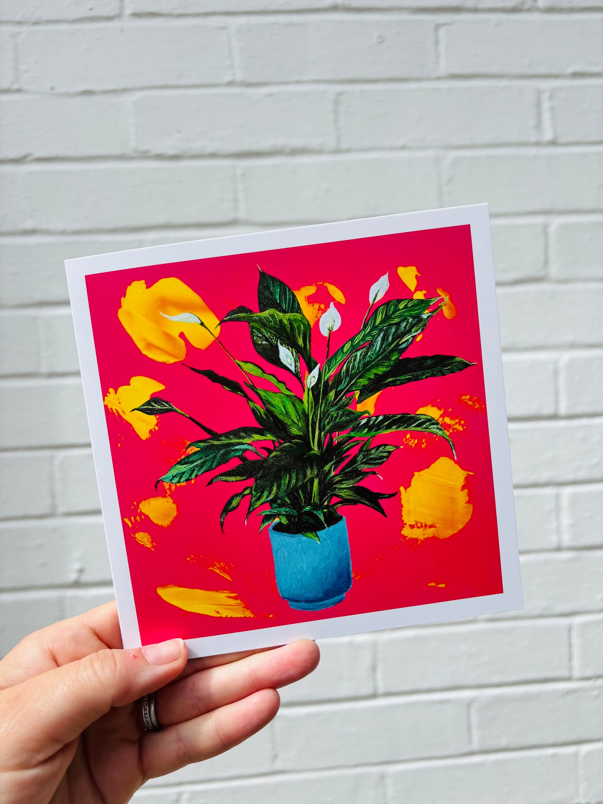The details of the peace lily are stunning on this fluorescent pink and yellow background. This square greeting card measures 150 x 150mm and is printed on 100% Recycled Matt 300gsm. It comes with a high-quality white envelope, safely packaged in a biodegradable clear bag.