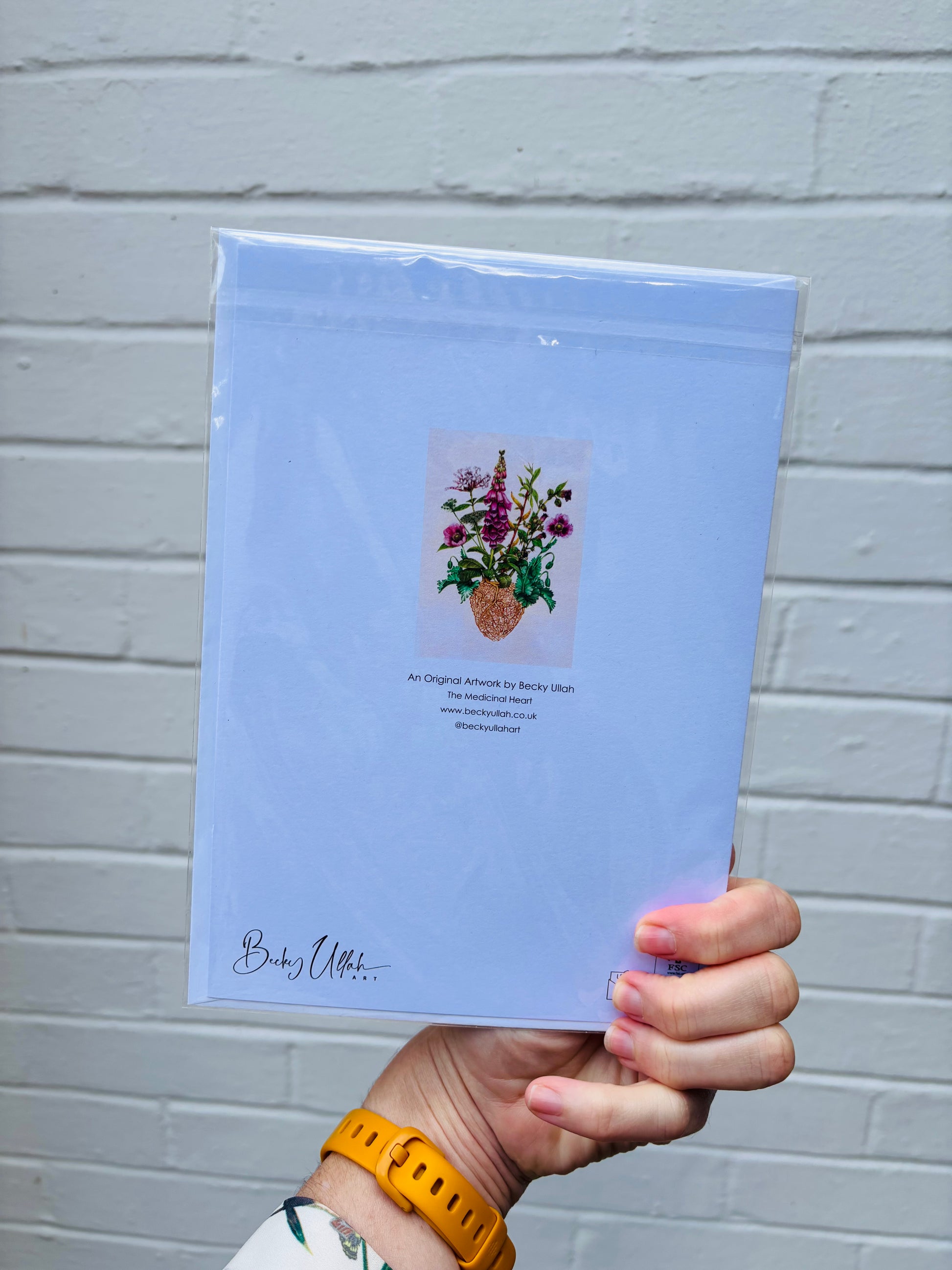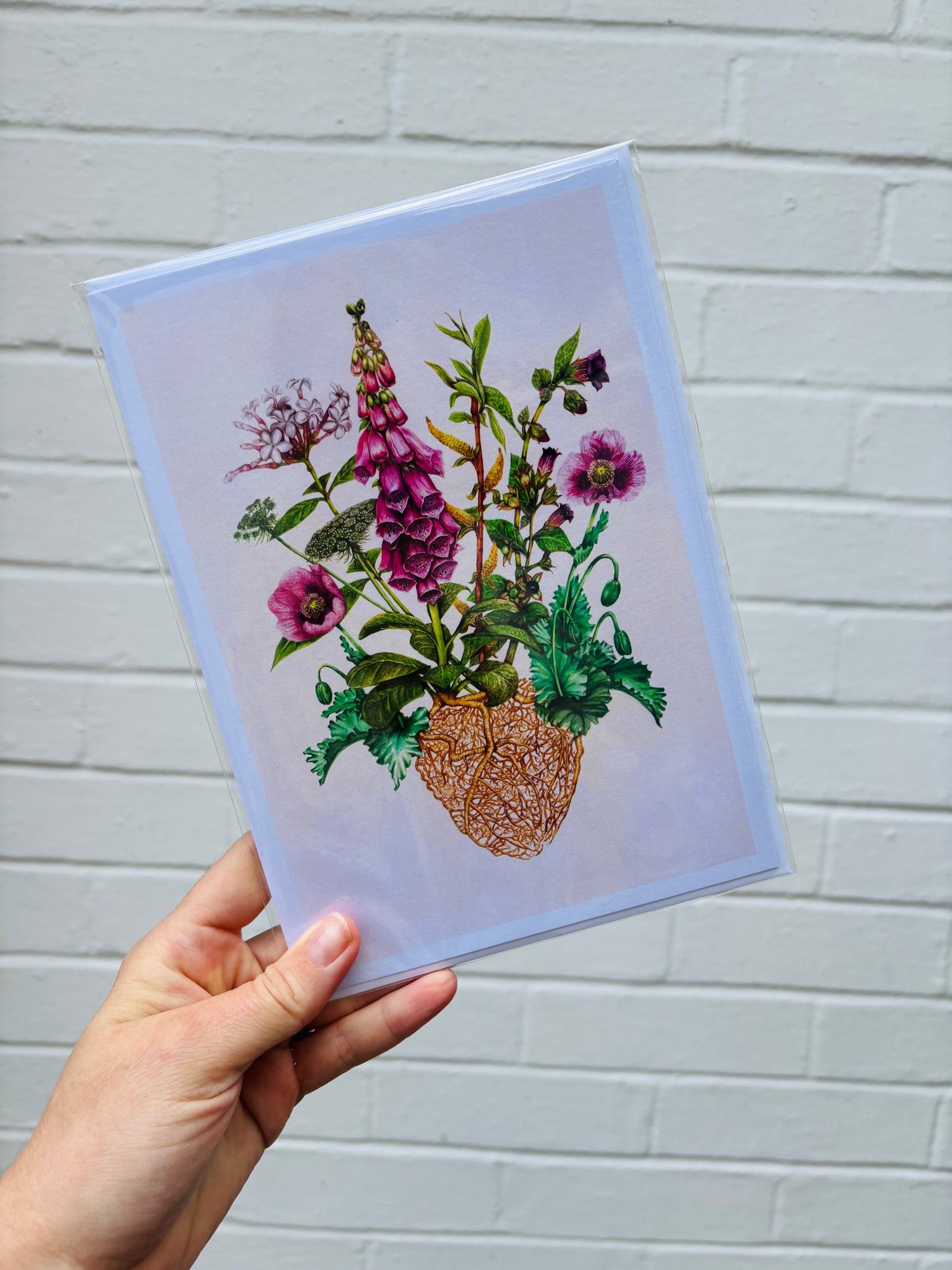 The A5 version of this card allows you to get a good look at all the wonderful details of the Medicinal Heart piece. This larger greetings card is printed on 100% Recycled Matt Paper FSC2 with an accompanying high quality white envelope.
