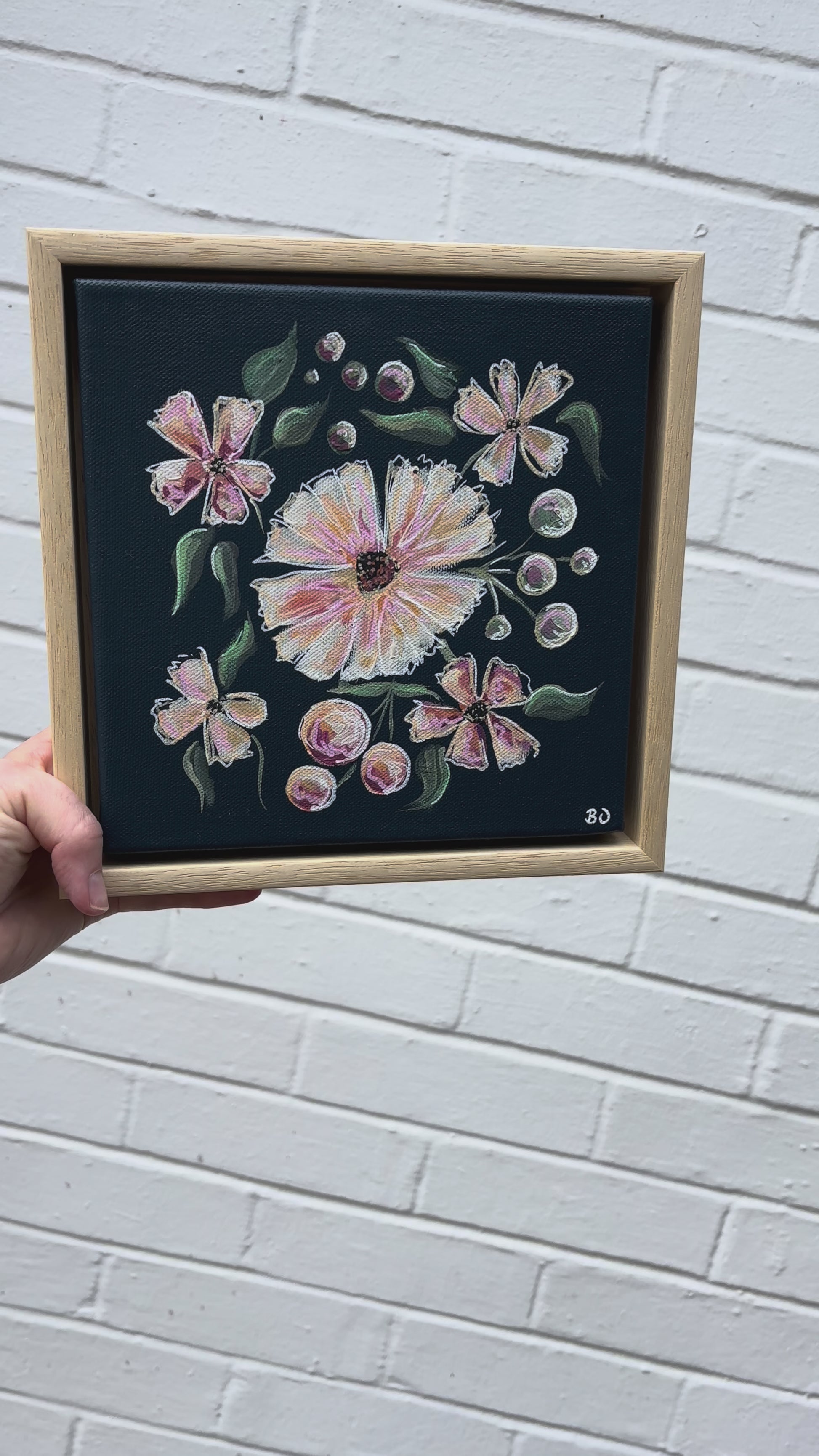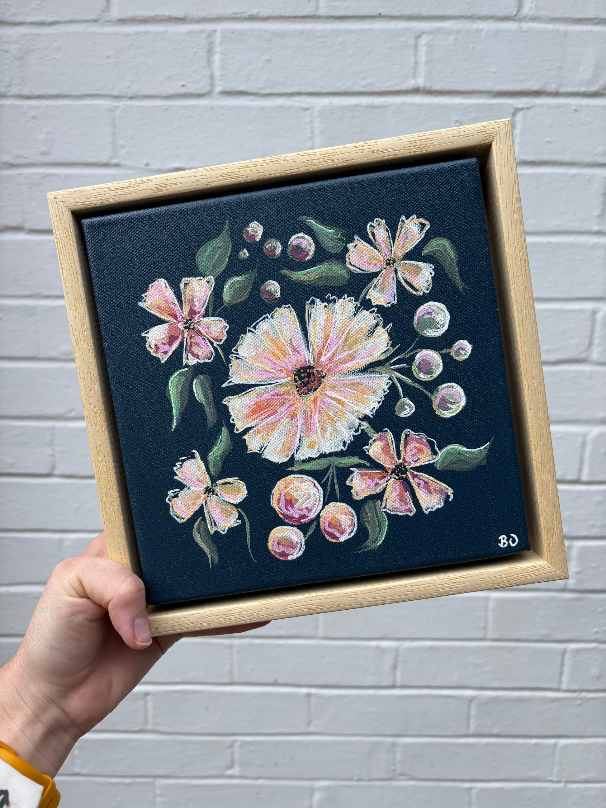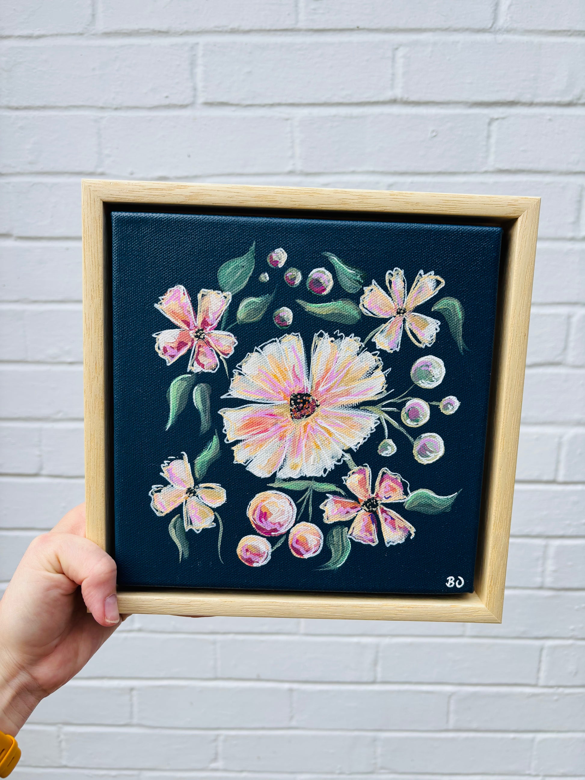 Set on a rich deep blue background these soft pink florals being serenity to any room. Framed in a barefaced pine floater frame it is elegant and contemporary at the same time. Pair it with some of the other pastel minis to make a stunning set.