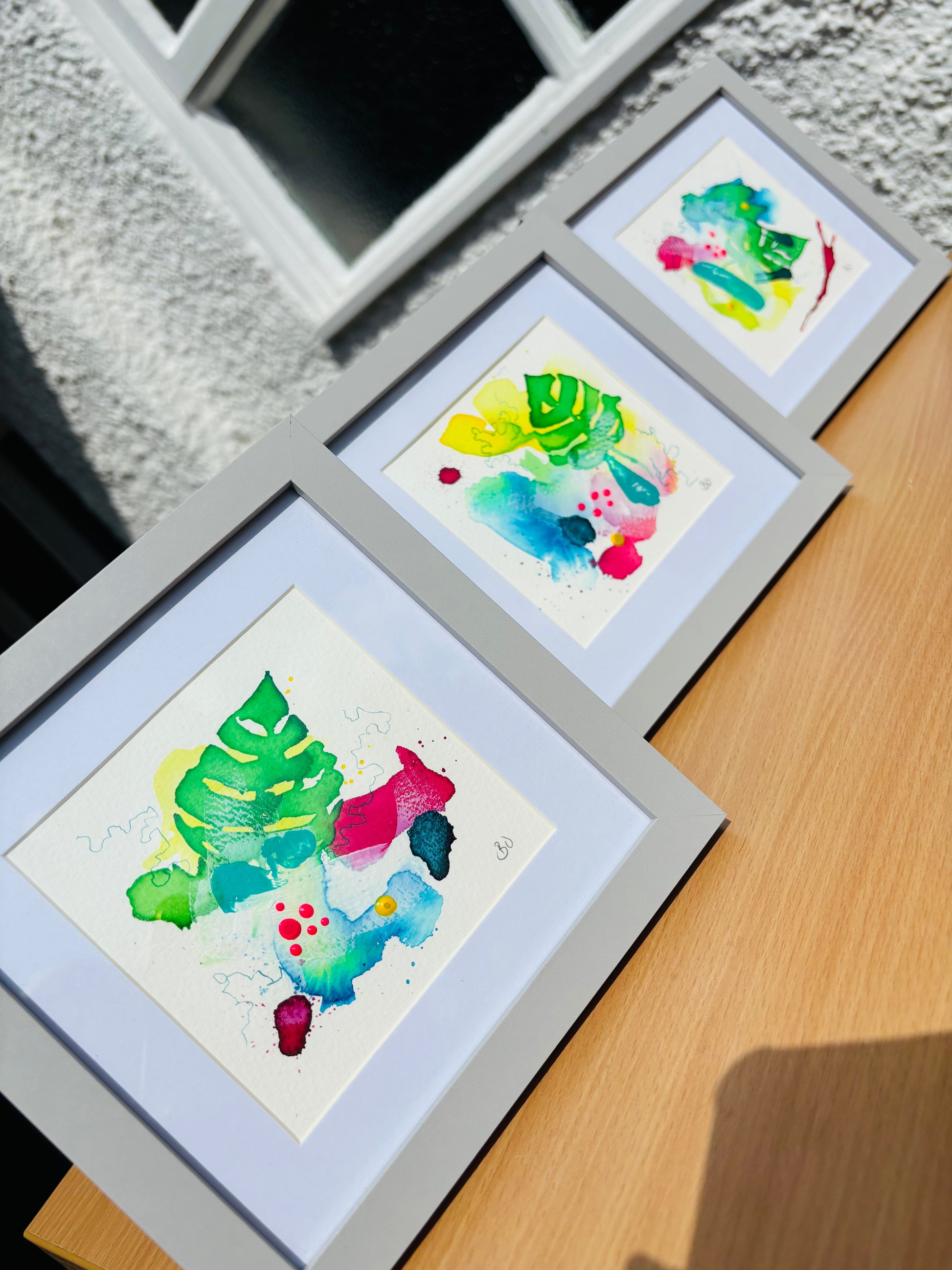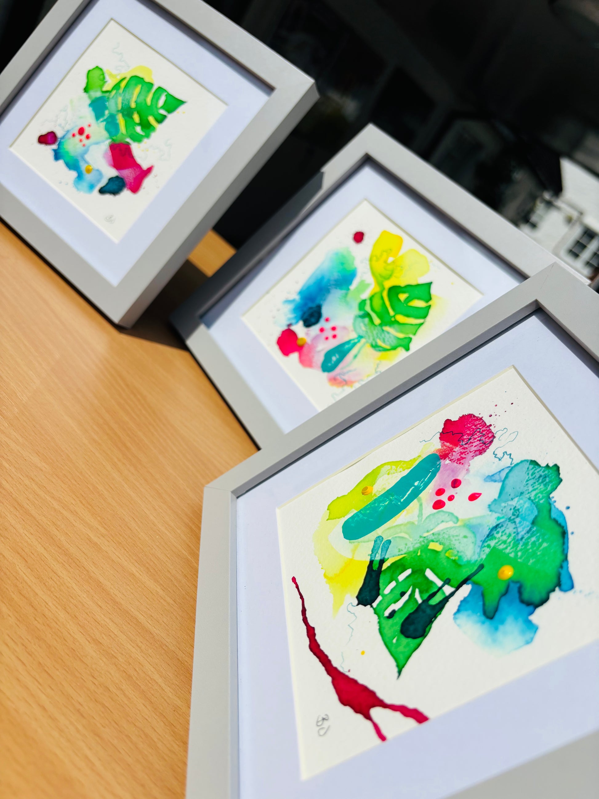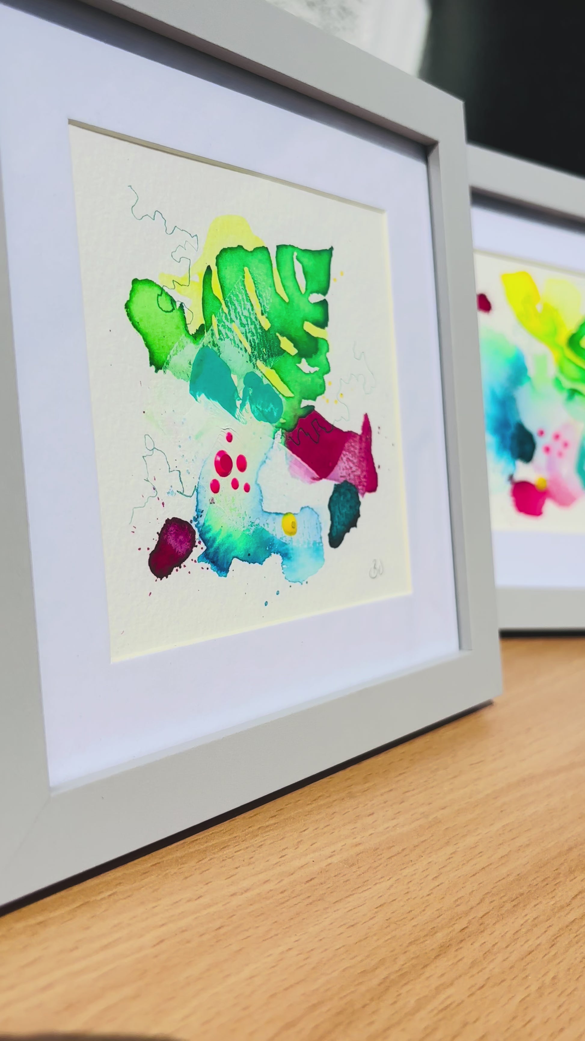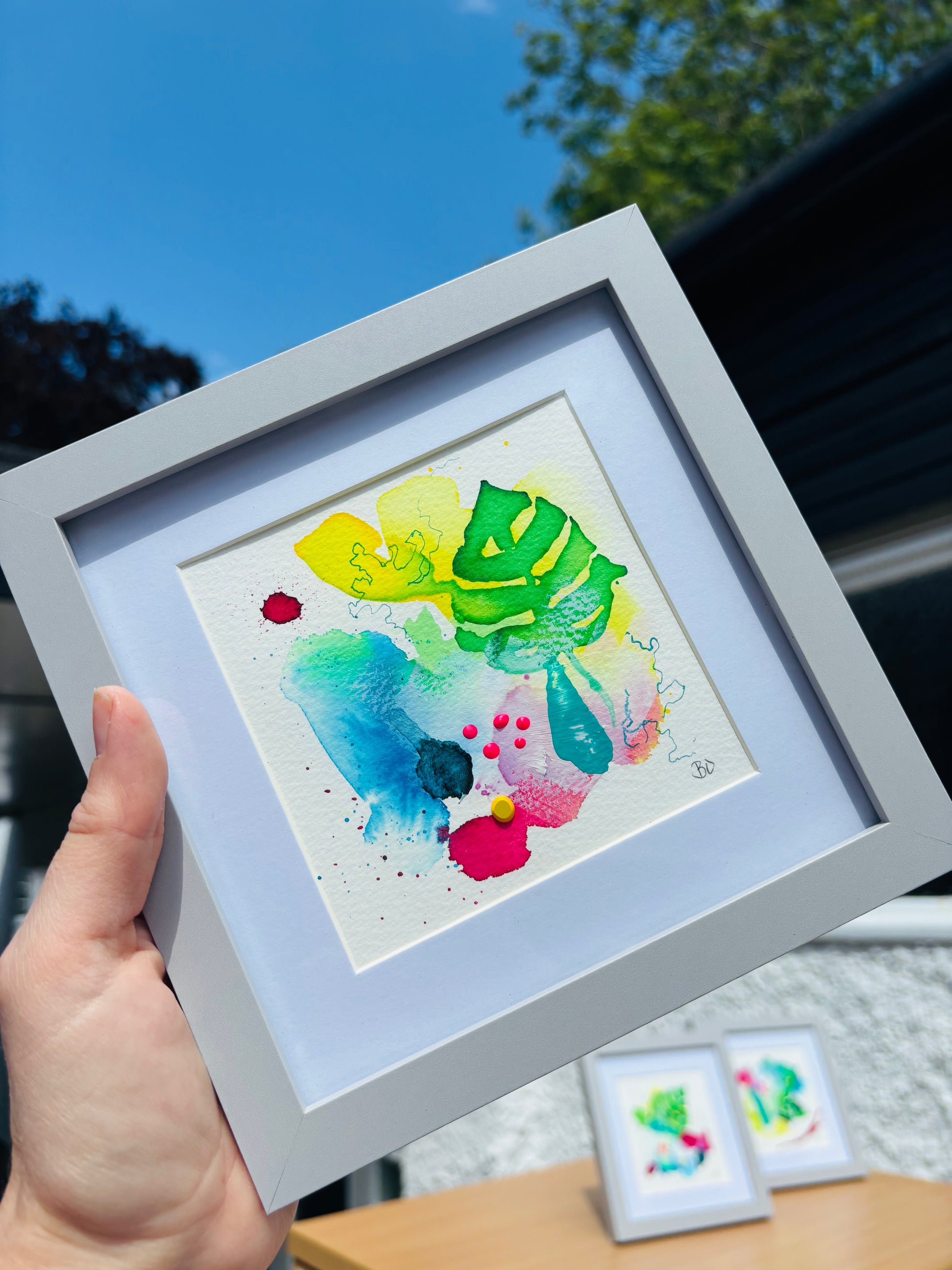 This is the first in a collection of 3 mini originals. Mixed media abstracts with dream-like watercolour washes and sweeps of bold acrylics overlaying them. The cute pops of colour are like a miniature plant rainbow in a frame!