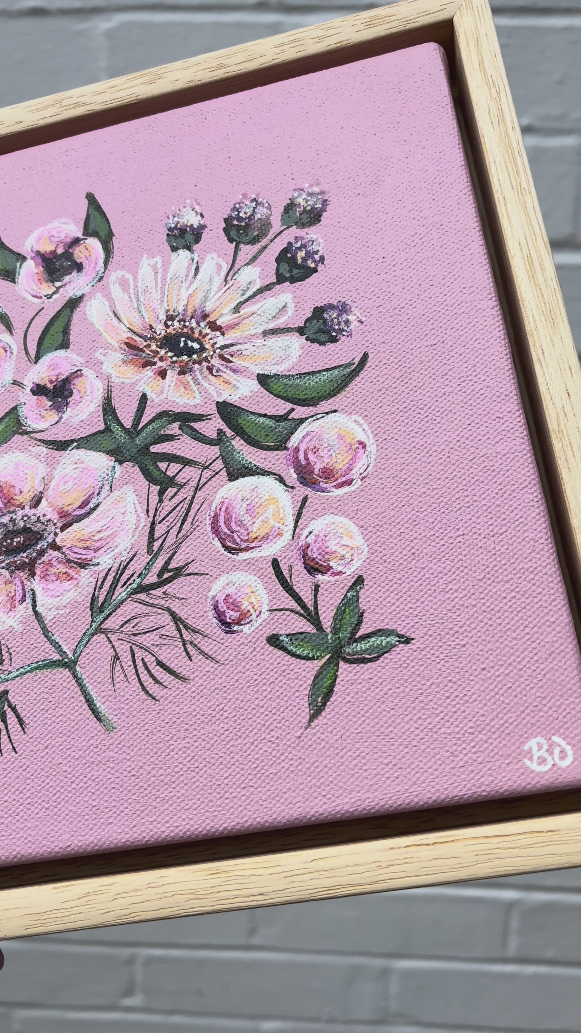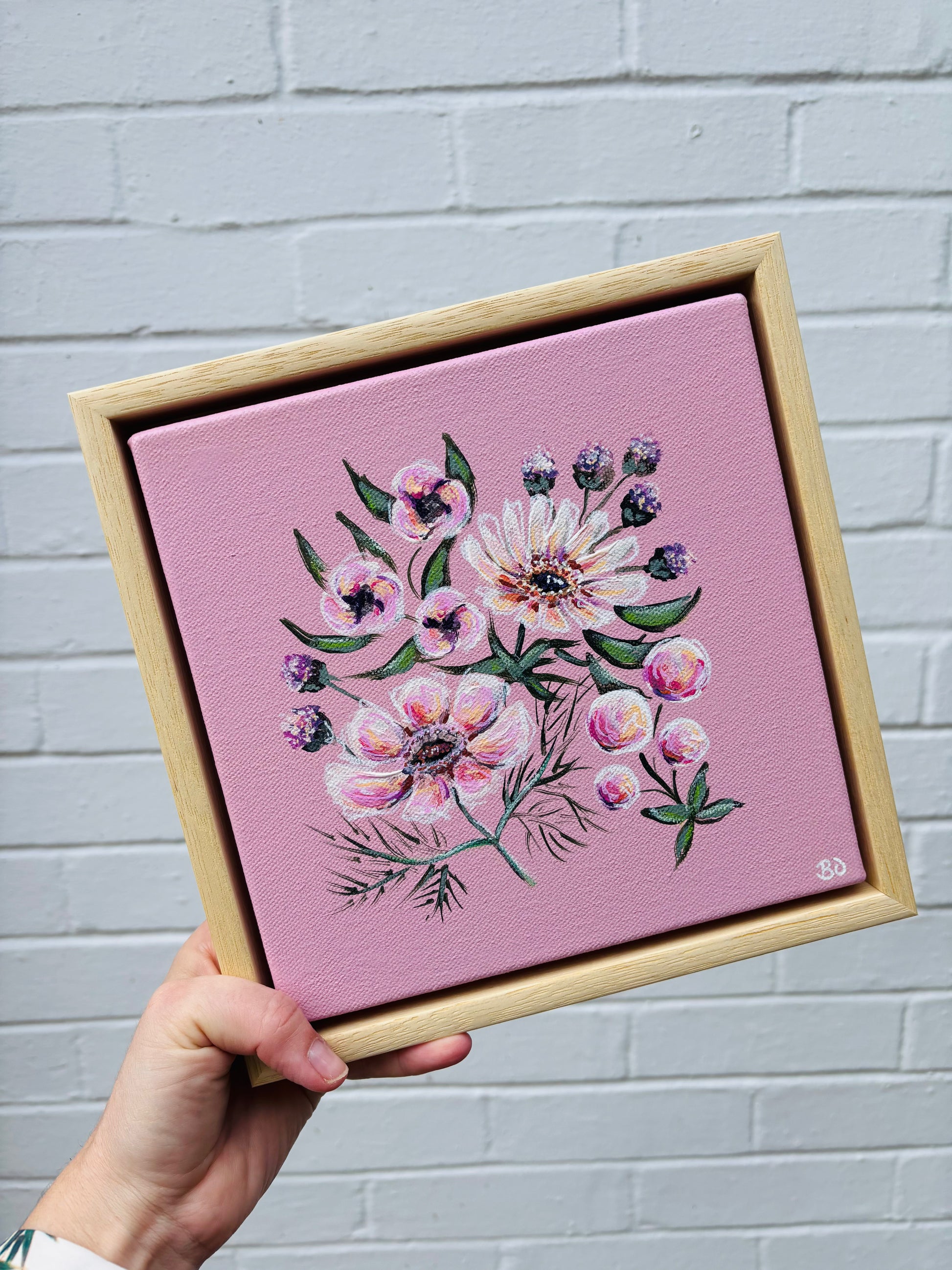 These candyfloss cosmos and cute geums just ooze country cottage garden. Framed in a barefaced pine floater frame it is elegant and contemporary at the same time. Pair it with some of the other pastel minis to make a stunning set.