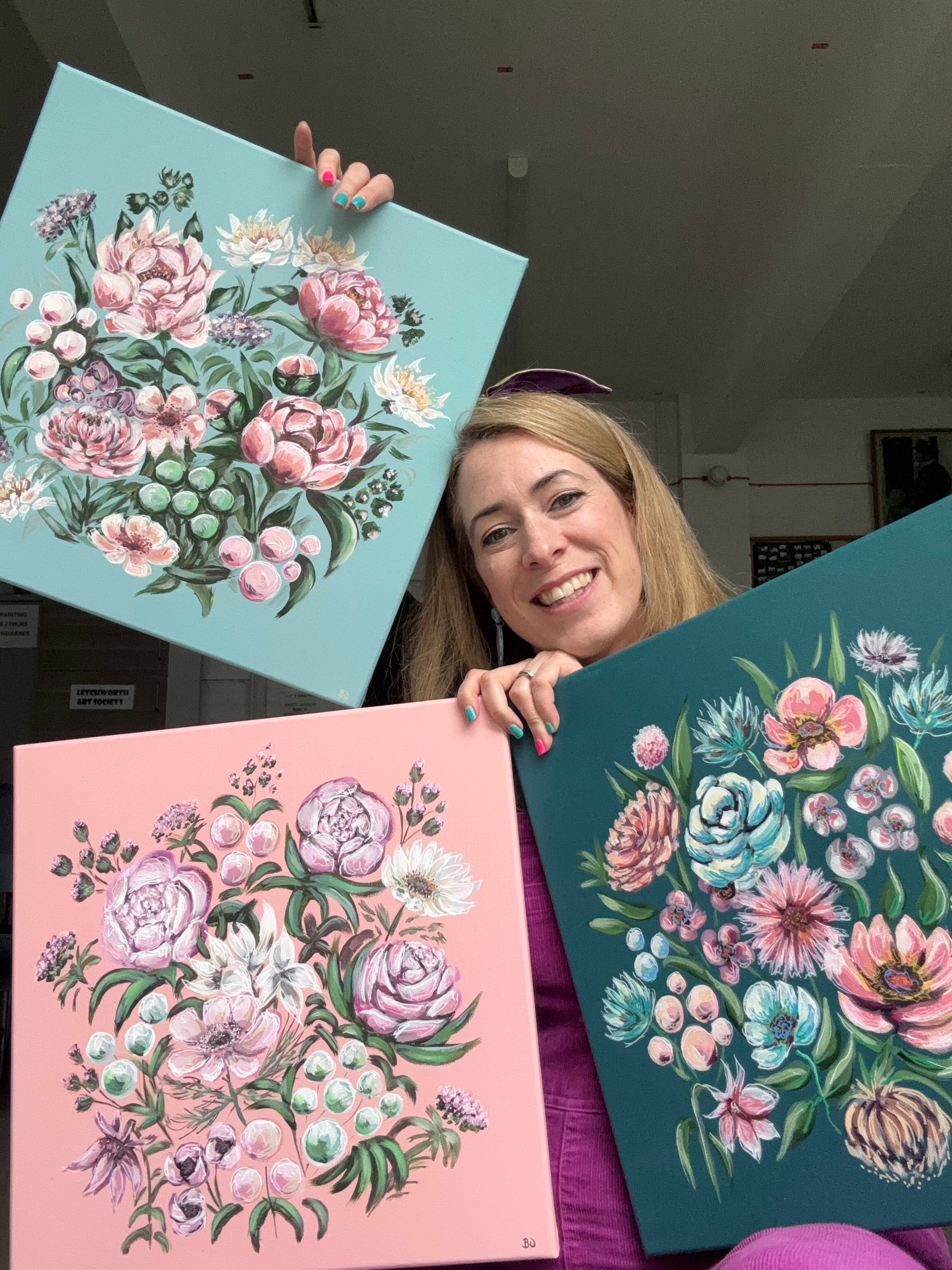 Acrylic on a 40 x 40cm canvas. Diameter 43cm. Comes framed and ready to hang with hanging cord on the back.