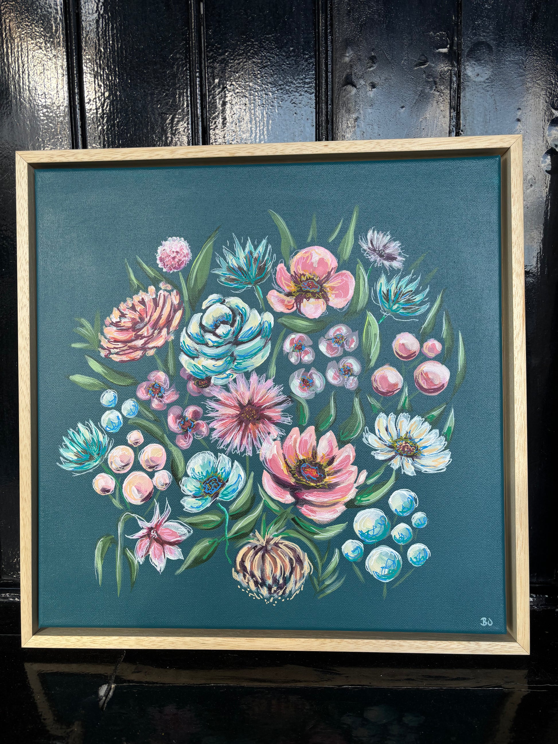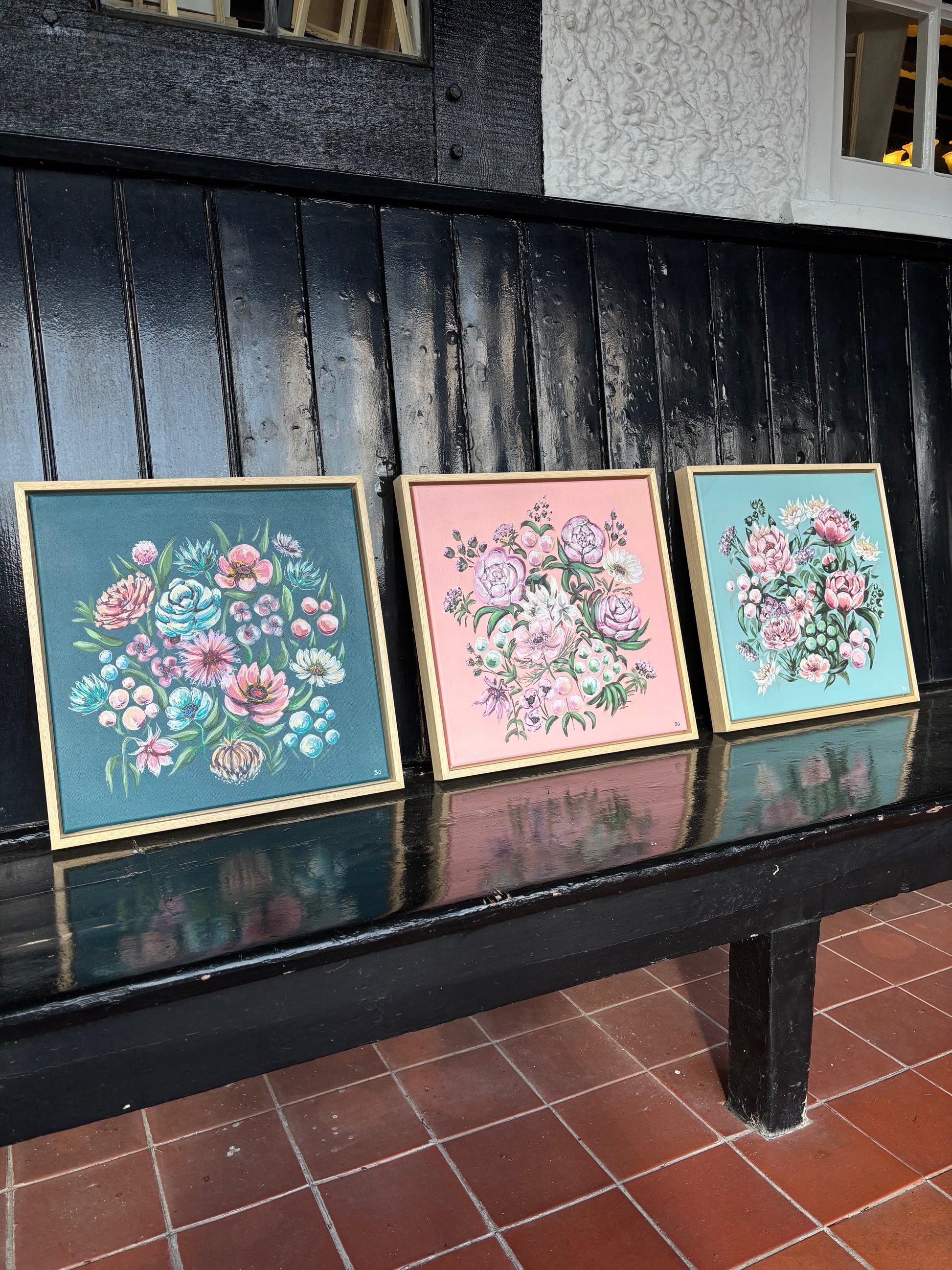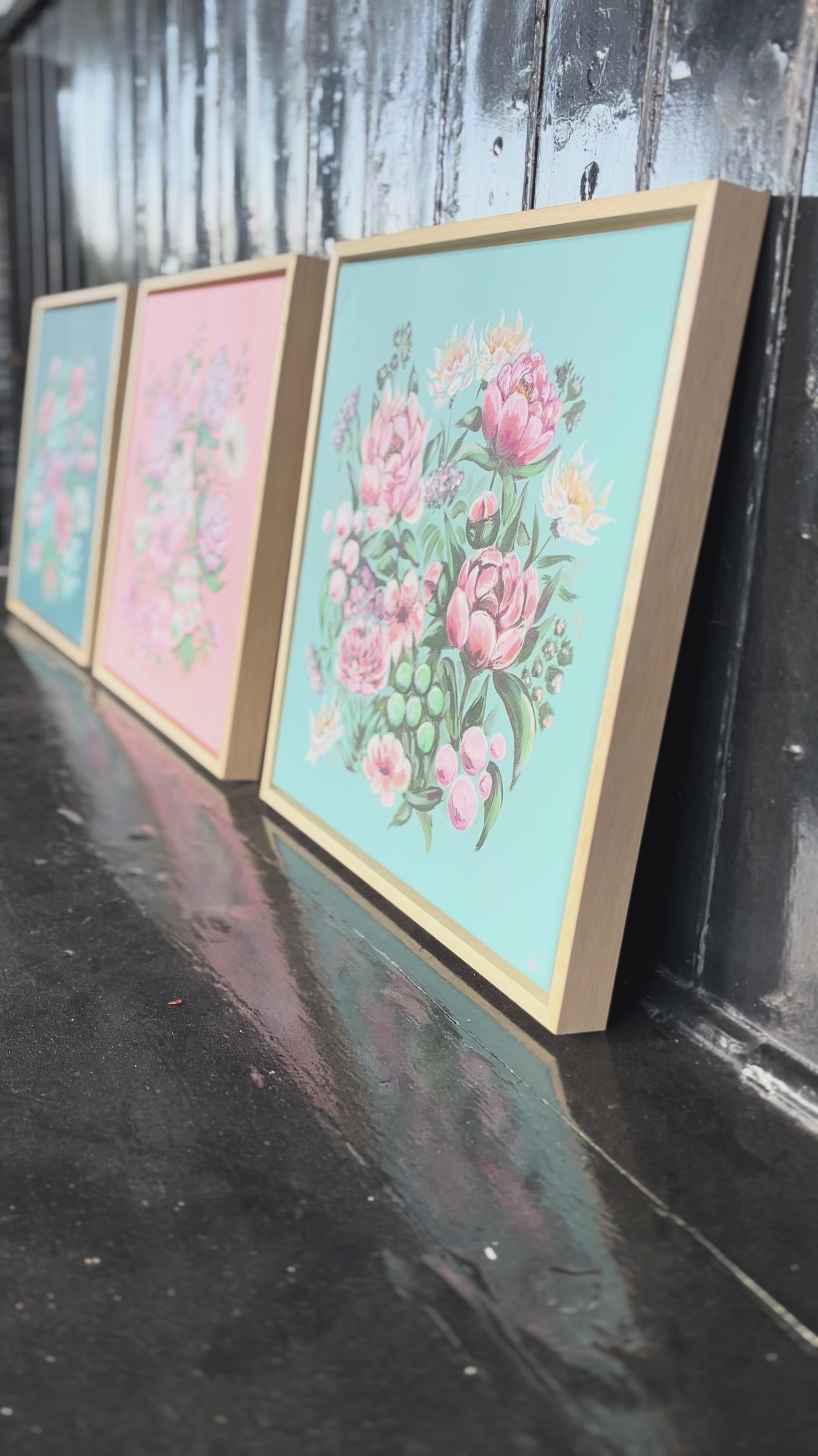 On a deep teal green backgrounf these soft pink and blue florals rest gently. Using similar palettes from the other two in this trio they draw the three together.