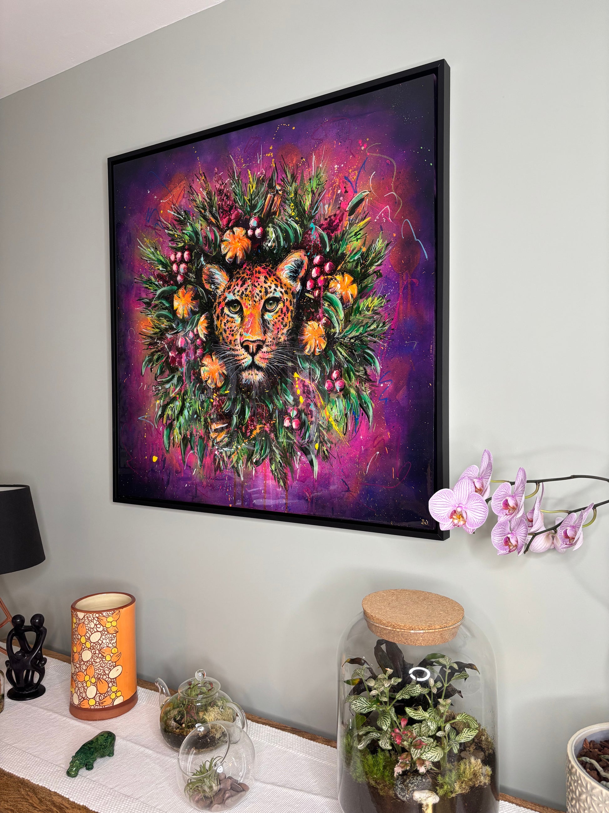 It arrives framed in a matte black, floater frame with a shadow gap. The panel is 76x76cm in size and arrives well packaged with a certificate of authenticity.