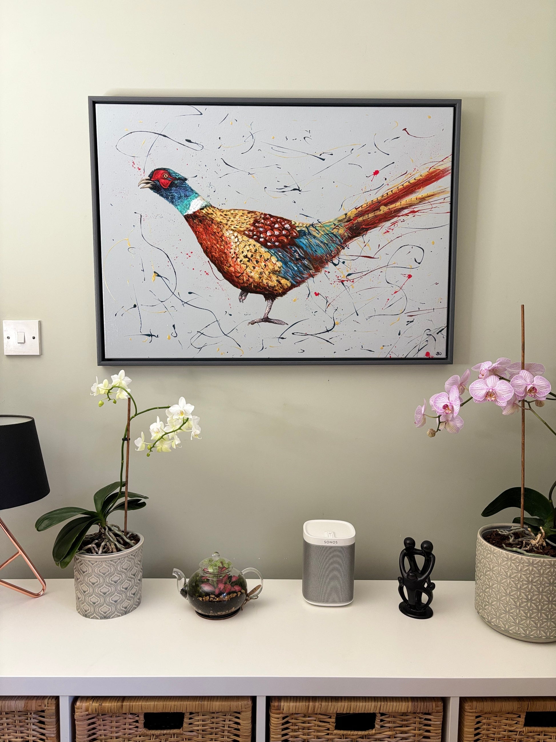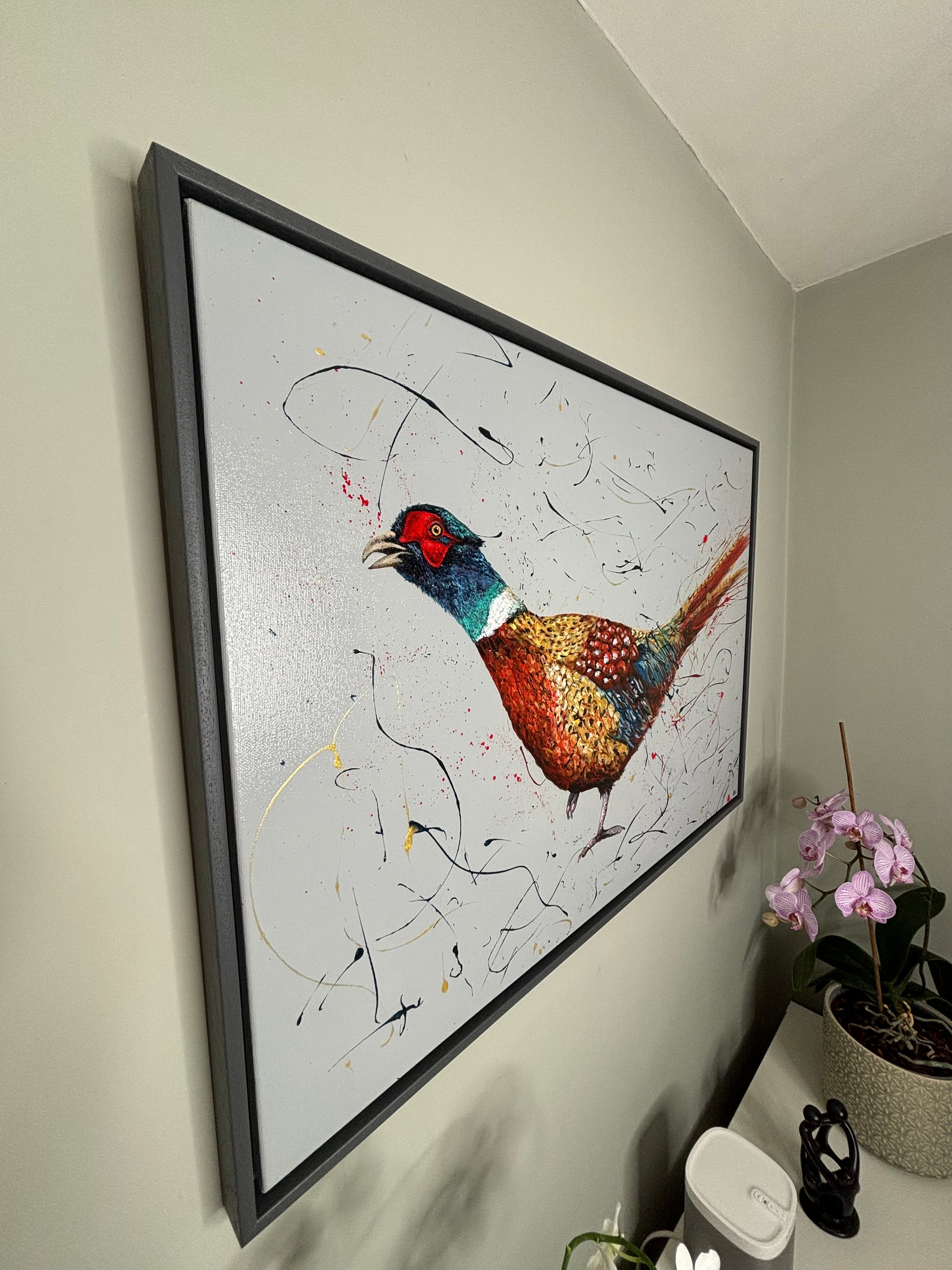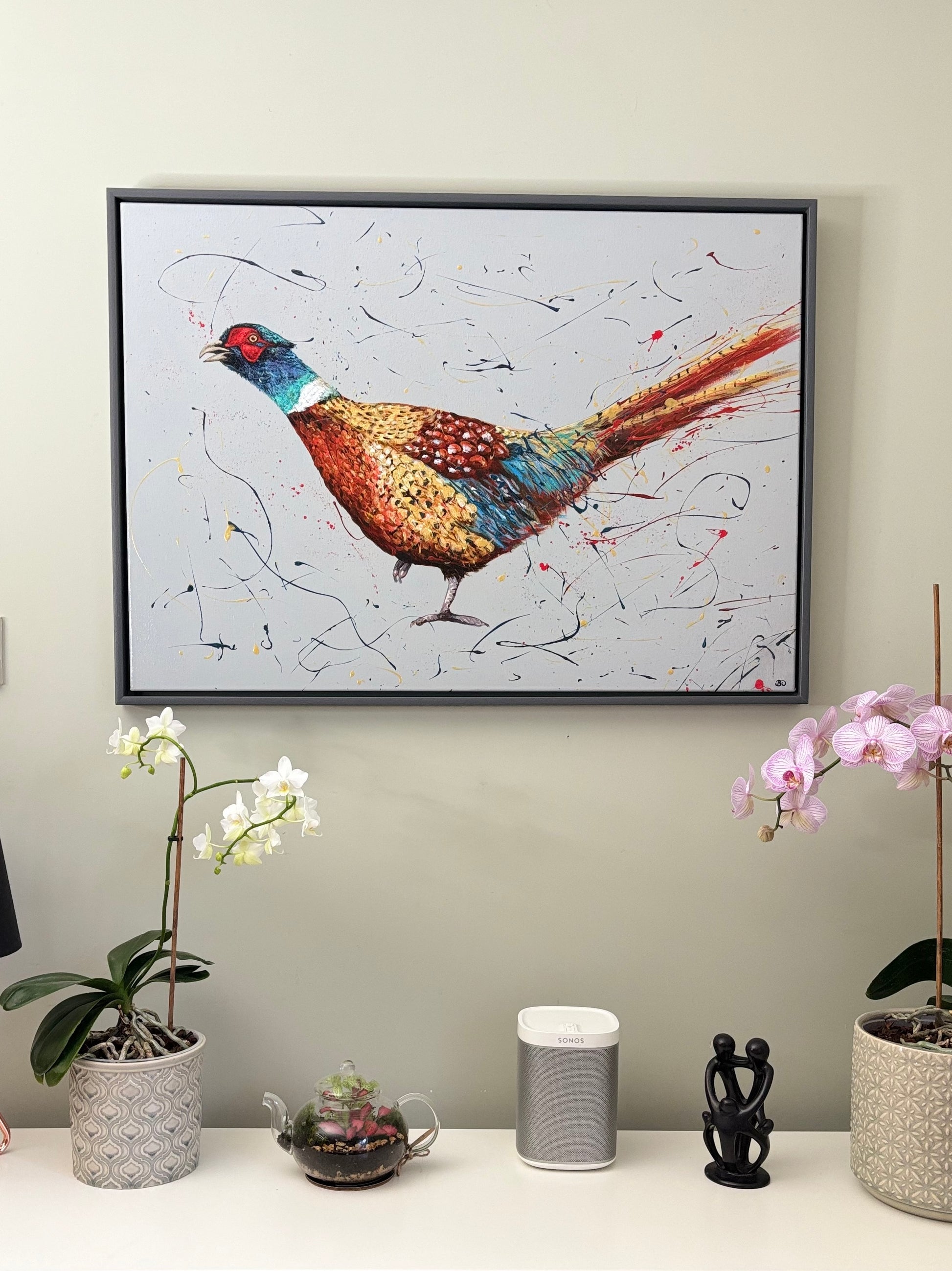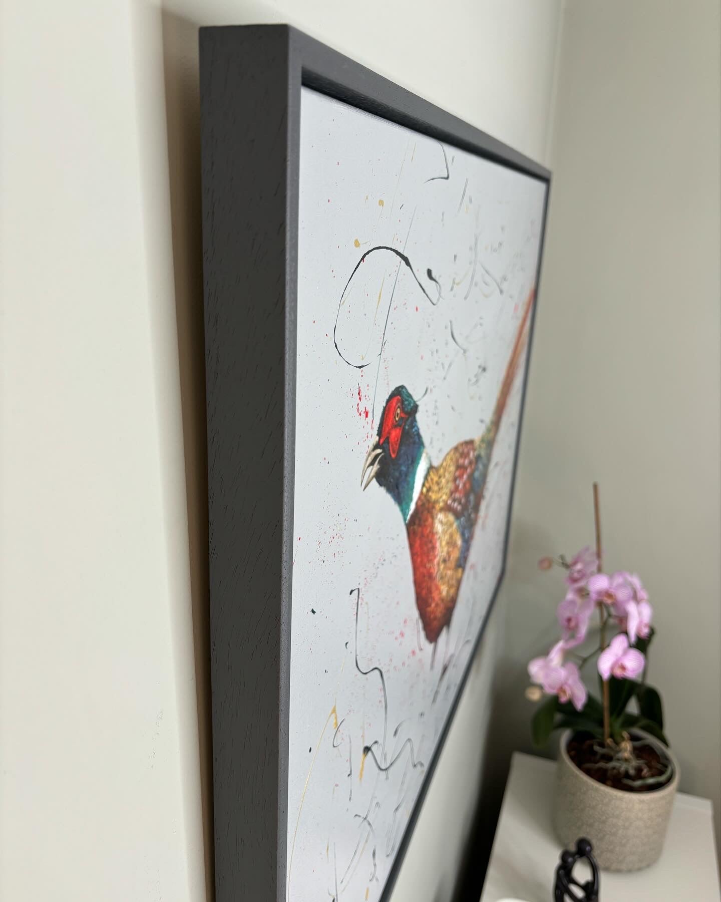 This A1, landscape, acrylic on canvas is framed in a dark grey painted wooden floater frame. It arrives well packaged with a certificate of authenticity.