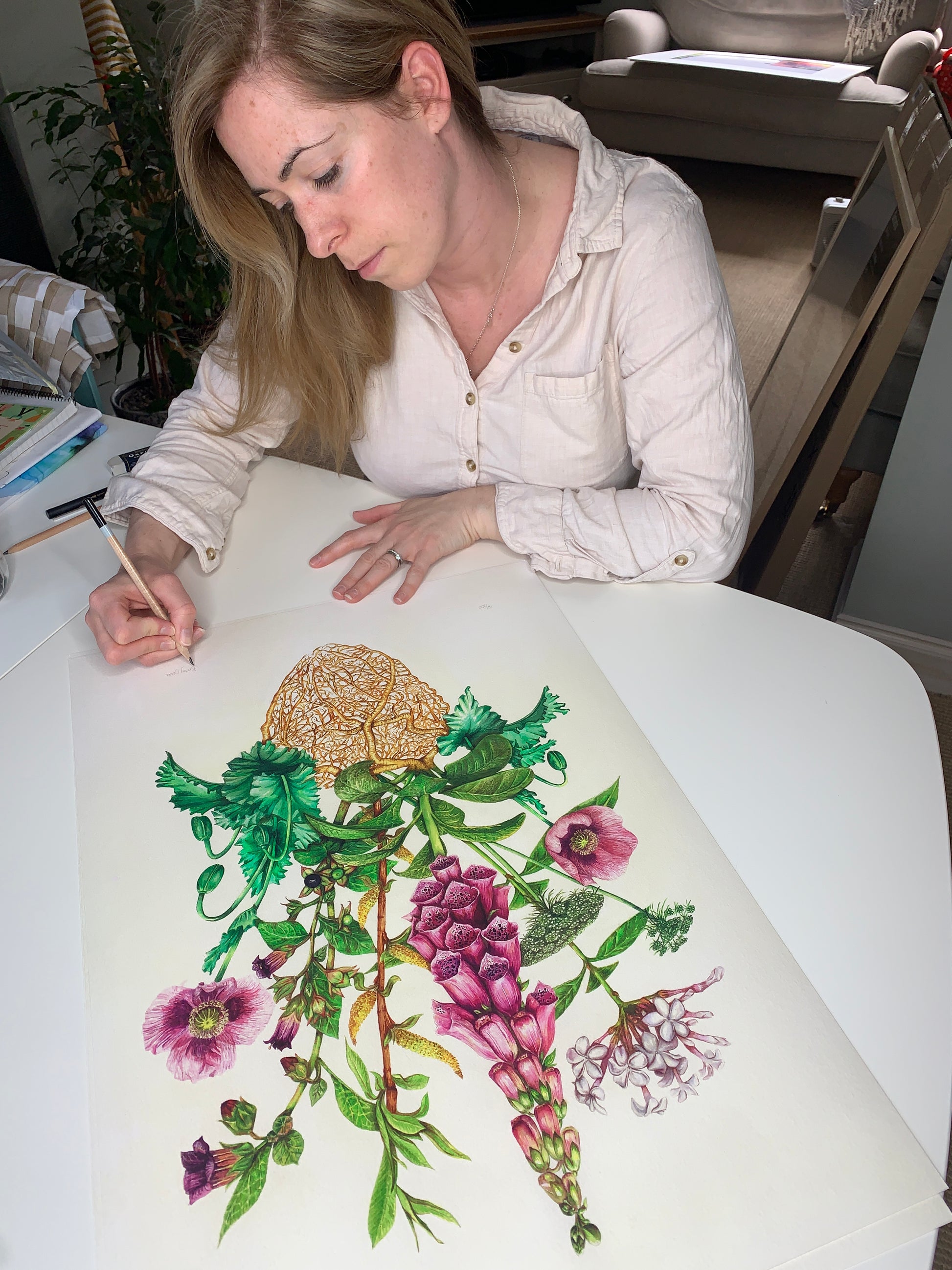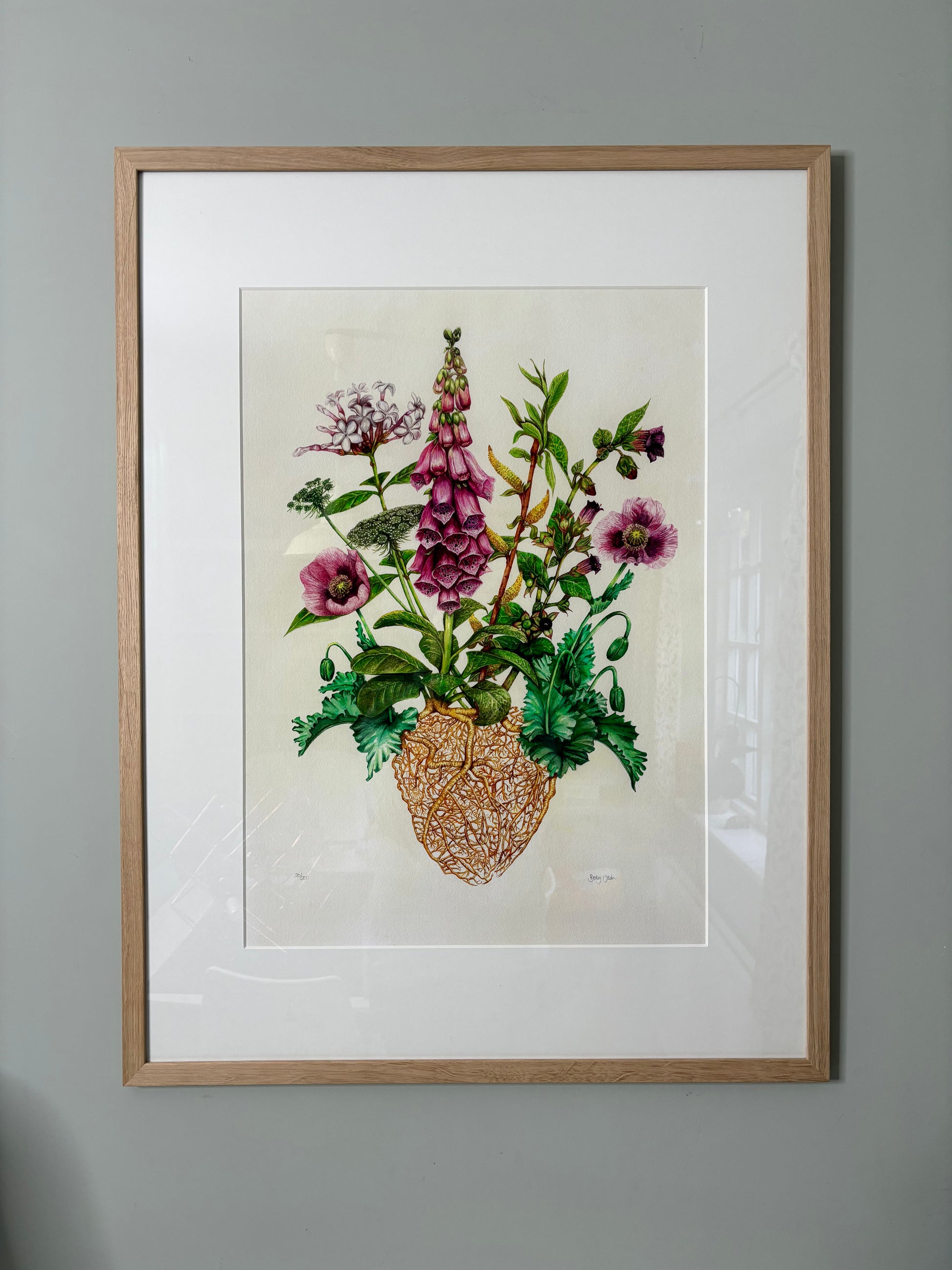 This exquisite piece of botanical art has a deeper story with the roots amassing into a network of anatomically accurate coronary arteries. The plants erupting from this meshwork all have origins for modern prescription cardiac medications (explained from left to right):