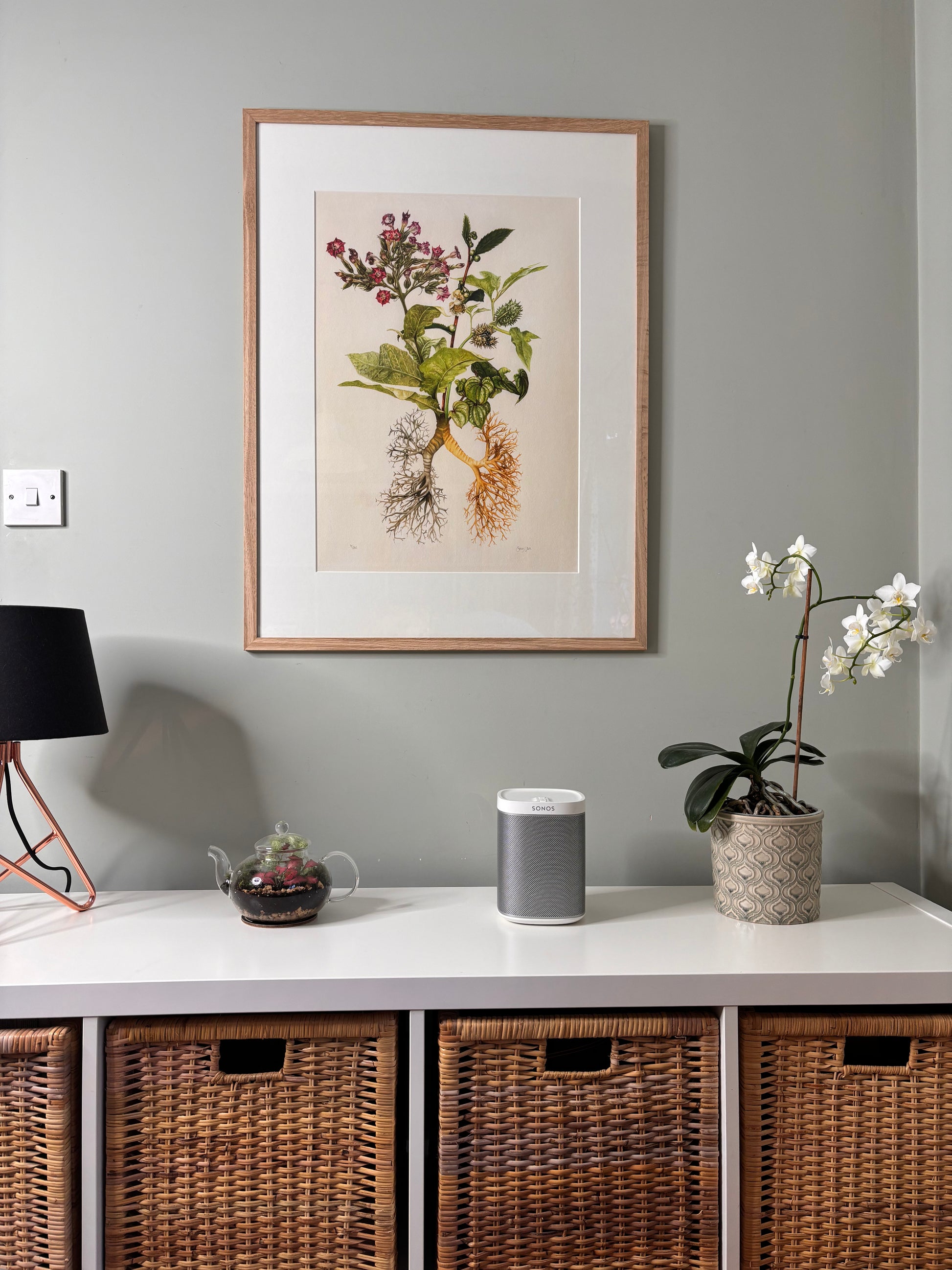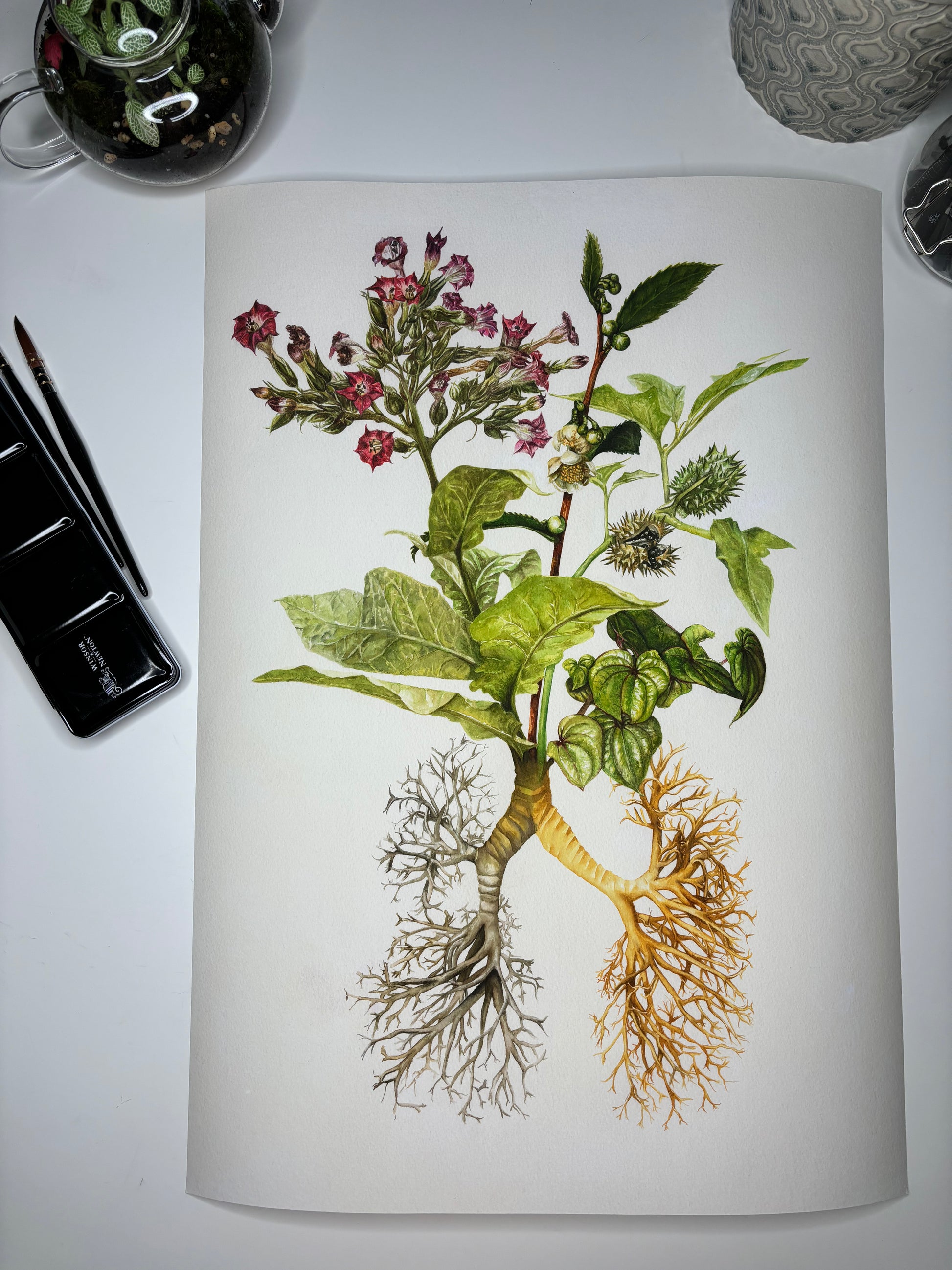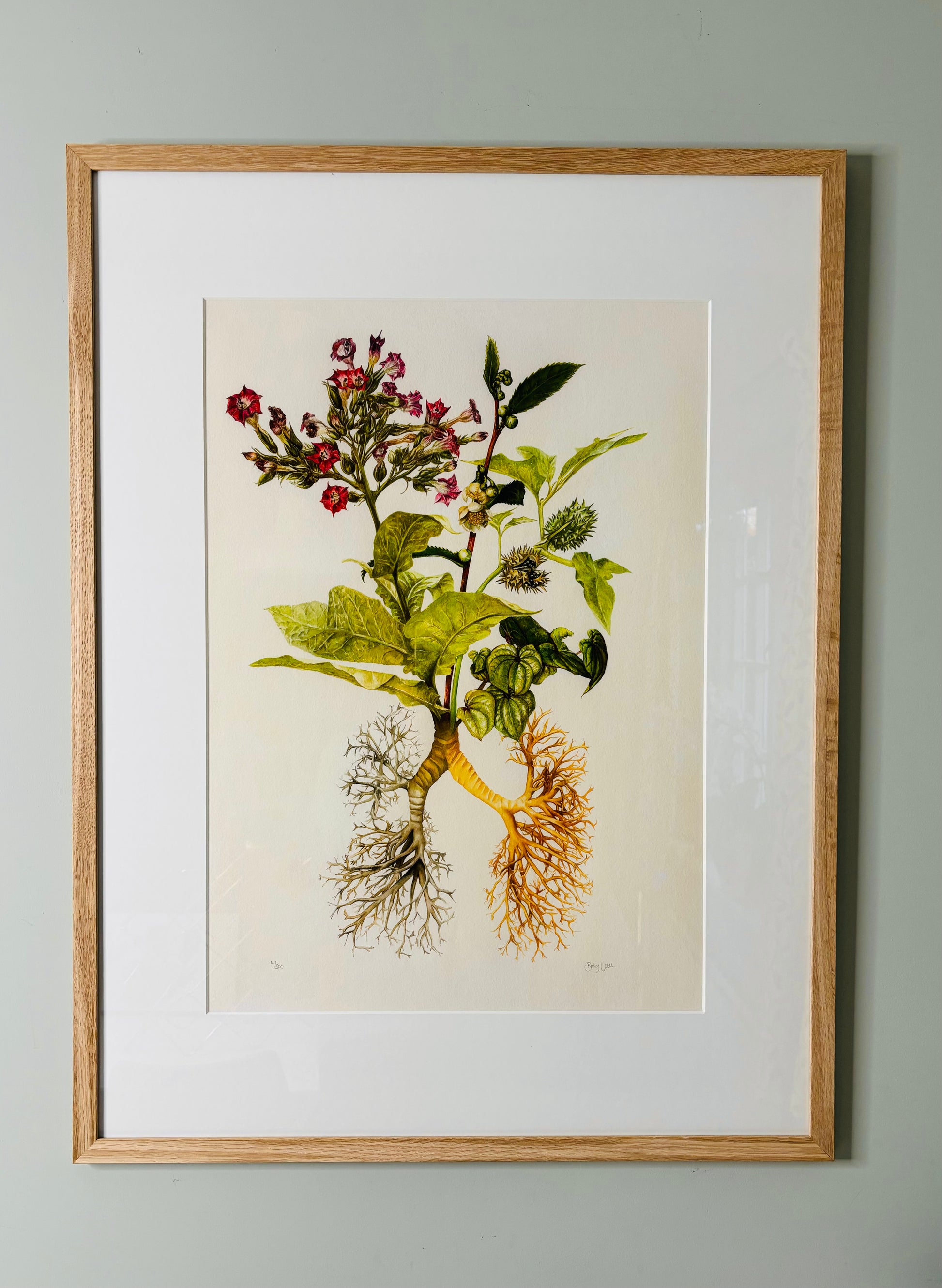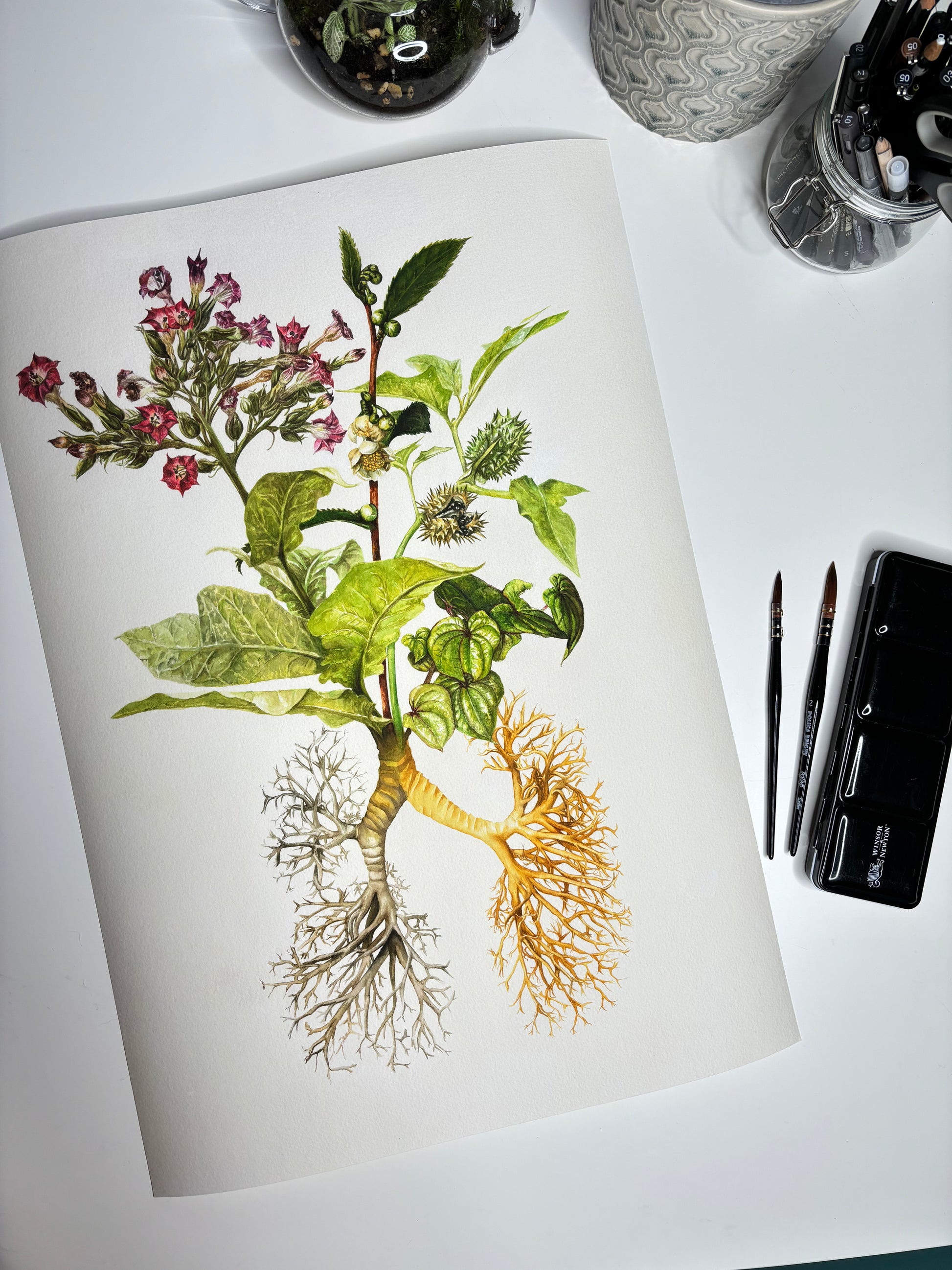 This is the second piece in a series of botanical illustrations, which aim to highlight where modern prescription medications were first derived. These medicinal plants grow out of a root system, which represents the organ these plants go on to treat. In this instance, the bronchial “tree”, which forms the lungs. In fact, this can be the “root” of delivery of several of these drugs: